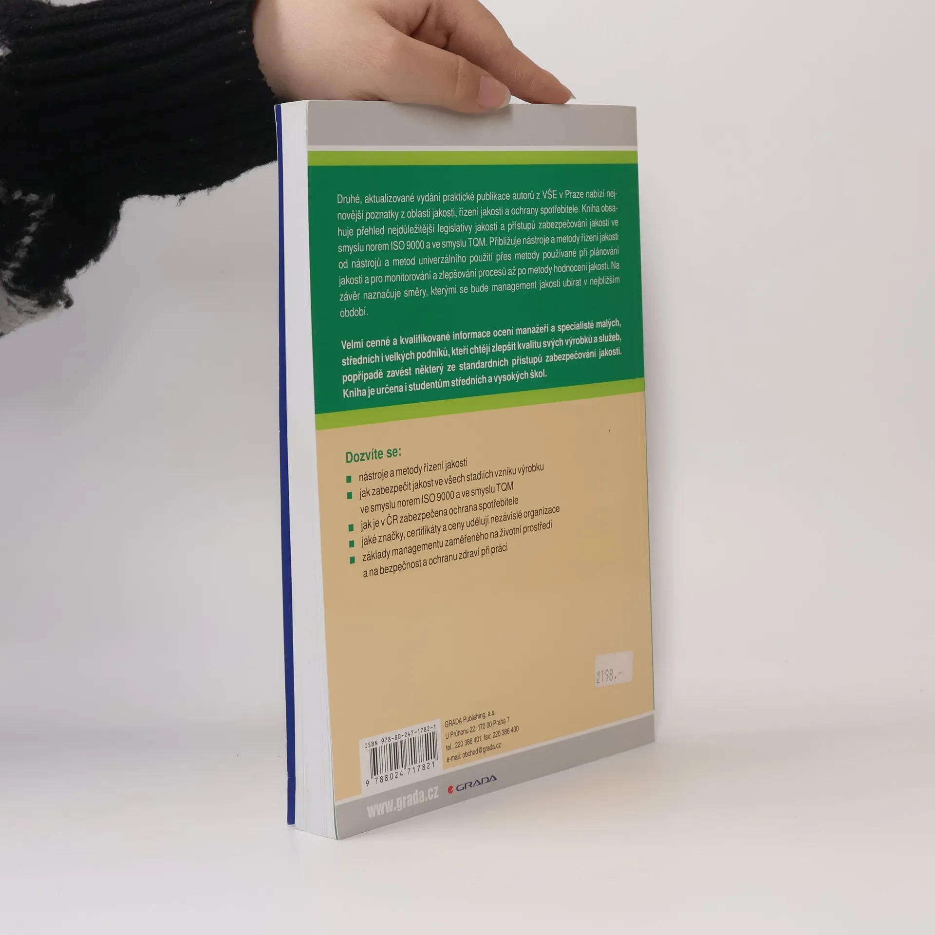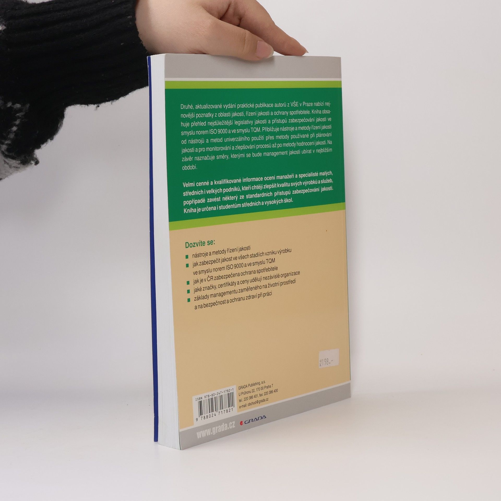 Druhé, aktualizované vydání praktické publikace nabízí nejnovější poznatky z oblasti jakosti, řízení jakosti a ochrany spotřebitele. Kniha obsahuje přehled nejdůležitější legislativy jakosti a přístupů zabezpečování jakosti ve smyslu norem ISO 9000 a ve smyslu TQM. Přibližuje nástroje a metody řízení jakosti od nástrojů a metod univerzálního použití přes metody používané při plánování jakosti a metody pro monitorování a zlepšování procesů až po metody hodnocení jakosti. Na závěr naznačuje směry, kterými se bude management jakosti ubírat v nejbližším období. Velmi cenné a kvalifikované informace ocení manažeři a specialisté malých, středních i velkých podniků, které chtějí zlepšit kvalitu svých výrobků a služeb, popřípadě zavést některý ze standardních přístupů zabezpečování jakosti. Kniha je dále určena studentům vysokých škol a středních a vyšších odborných škol i pro použití ve výuce na středních odborných učilištích.