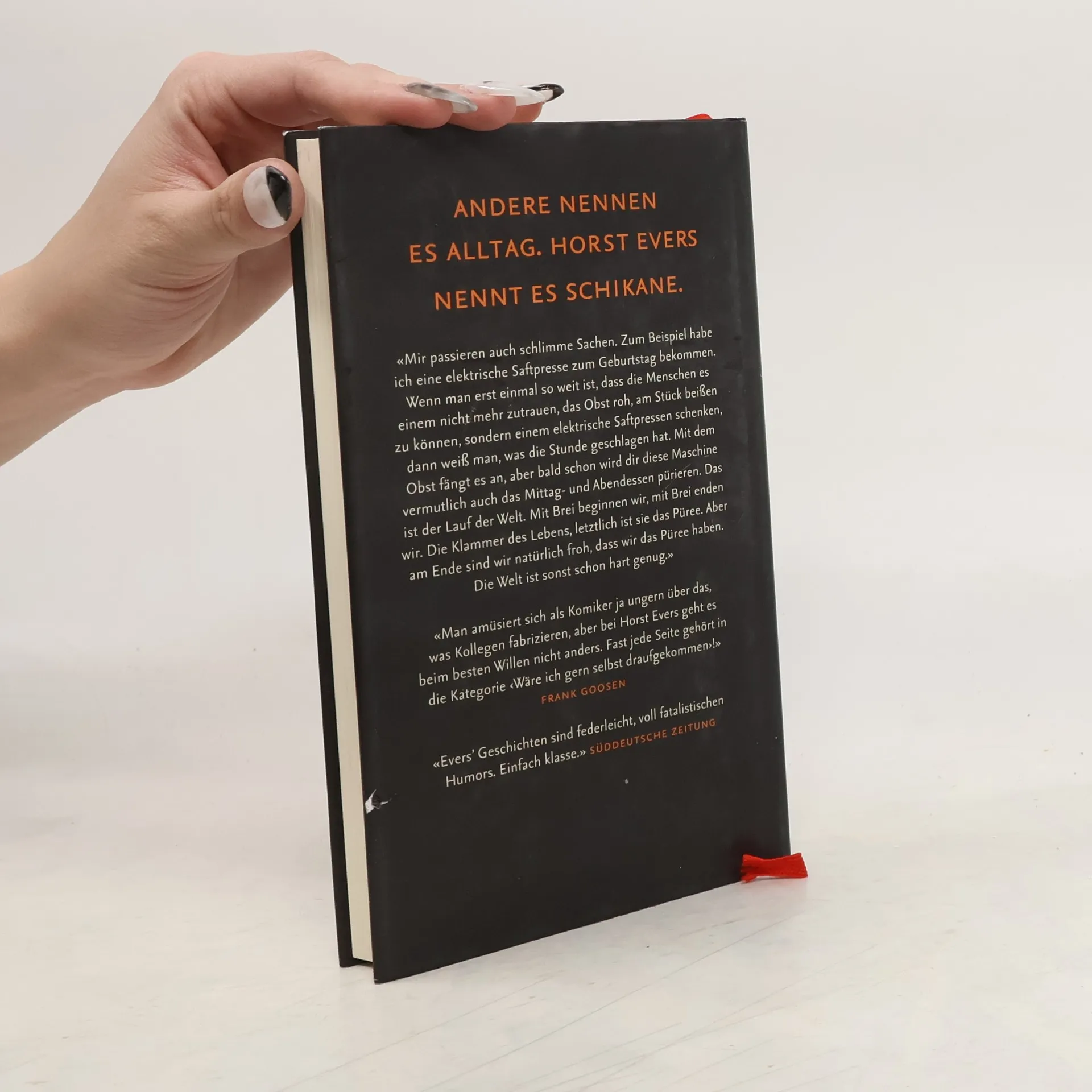 Andere nennen es Alltag. Horst Evers nennt es Schikane.«Mir passieren auch schlimme Sachen. Zum Beispiel habe ich eine elektrische Saftpresse zum Geburtstag bekommen. Wenn man erst einmal so weit ist, dass die Menschen es einem nicht mehr zutrauen, das Obst roh, am Stück beißen zu können, sondern einem elektrische Saftpressen schenken, dann weiß man, was die Stunde geschlagen hat. Mit dem Obst fängt es an, aber bald schon wird dir diese Maschine vermutlich auch das Mittag- und Abendessen pürieren. Das ist der Lauf der Welt. Mit Brei beginnen wir, mit Brei enden wir. Die Klammer des Lebens, letztlich ist sie das Püree. Aber am Ende sind wir natürlich froh, dass wir das Püree haben. Die Welt ist sonst schon hart genug.»«Man amüsiert sich als Komiker ja ungern über das, was Kollegen fabrizieren, aber bei Horst Evers geht es beim besten Willen nicht anders. Fast jede Seite gehört in die Kategorie ‹Wäre ich gern selbst draufgekommen›!» Frank Goosen«Evers’ Geschichten sind federleicht, voll fatalistischen Humors. Einfach klasse.» Süddeutsche Zeitung