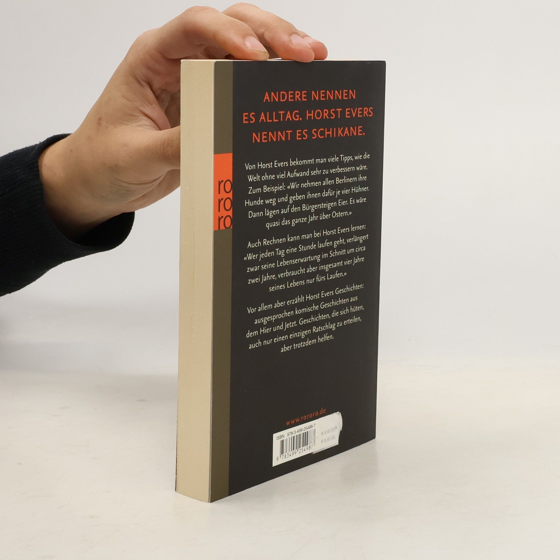 Andere nennen es Alltag. Horst Evers nennt es Schikane. Von Horst Evers bekommt man viele Tipps, wie die Welt ohne viel Aufwand sehr zu verbessern wäre. Zum Beispiel: «Wir nehmen allen Berlinern ihre Hunde weg und geben ihnen dafür je vier Hühner. Dann lägen auf den Bürgersteigen Eier. Es wäre quasi das ganze Jahr über Ostern.» Auch Rechnen kann man bei Horst Evers lernen: «Wer jeden Tag eine Stunde laufen geht, verlängert zwar seine Lebenserwartung im Schnitt um circa zwei Jahre, verbraucht aber insgesamt vier Jahre seines Lebens nur fürs Laufen.» Vor allem aber erzählt Horst Evers Geschichten: ausgesprochen komische Geschichten aus dem Hier und Jetzt. Geschichten, die sich hüten, auch nur einen einzigen Ratschlag zu erteilen, aber trotzdem helfen.