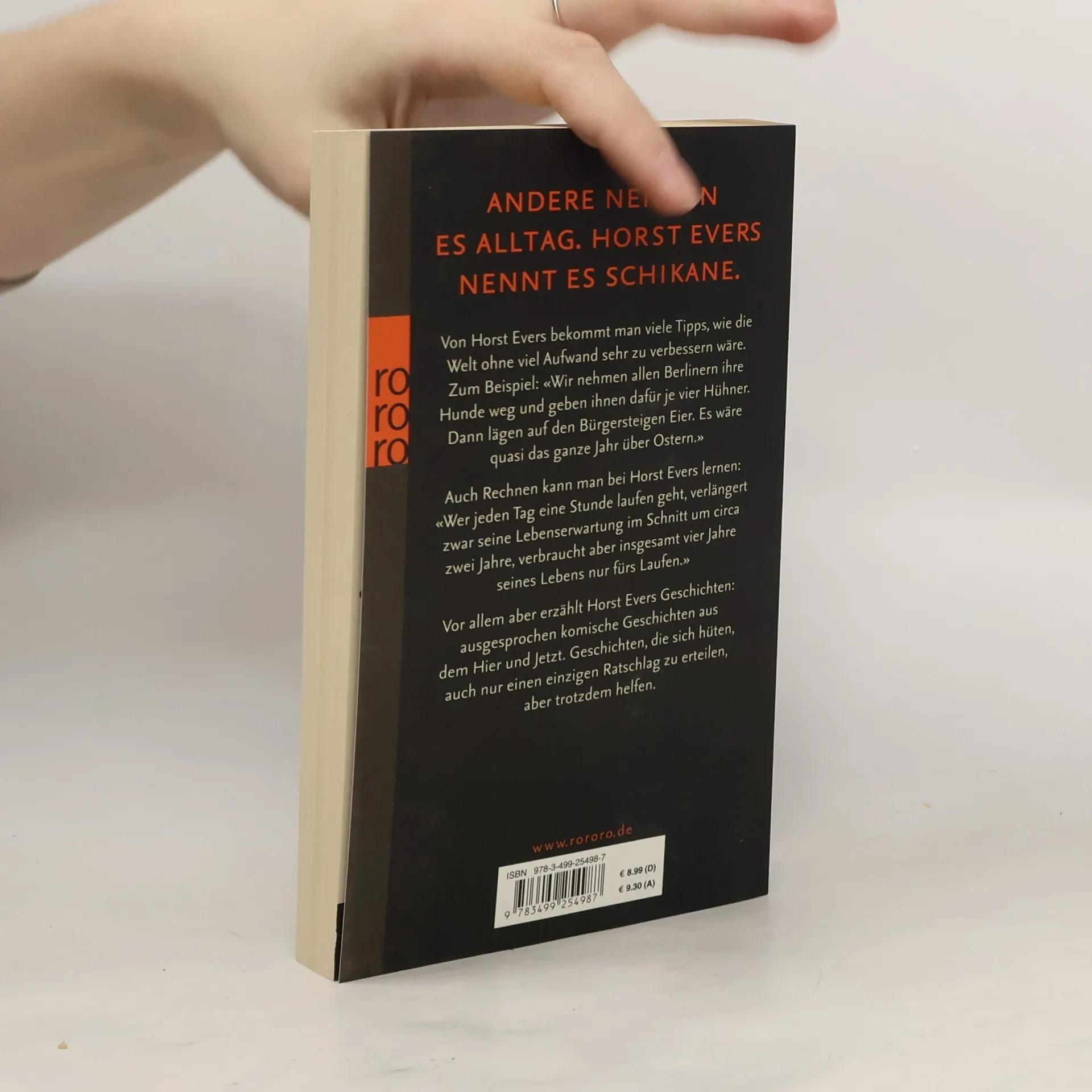 Andere nennen es Alltag. Horst Evers nennt es Schikane. Von Horst Evers bekommt man viele Tipps, wie die Welt ohne viel Aufwand sehr zu verbessern wäre. Zum Beispiel: «Wir nehmen allen Berlinern ihre Hunde weg und geben ihnen dafür je vier Hühner. Dann lägen auf den Bürgersteigen Eier. Es wäre quasi das ganze Jahr über Ostern.» Auch Rechnen kann man bei Horst Evers lernen: «Wer jeden Tag eine Stunde laufen geht, verlängert zwar seine Lebenserwartung im Schnitt um circa zwei Jahre, verbraucht aber insgesamt vier Jahre seines Lebens nur fürs Laufen.» Vor allem aber erzählt Horst Evers Geschichten: ausgesprochen komische Geschichten aus dem Hier und Jetzt. Geschichten, die sich hüten, auch nur einen einzigen Ratschlag zu erteilen, aber trotzdem helfen.