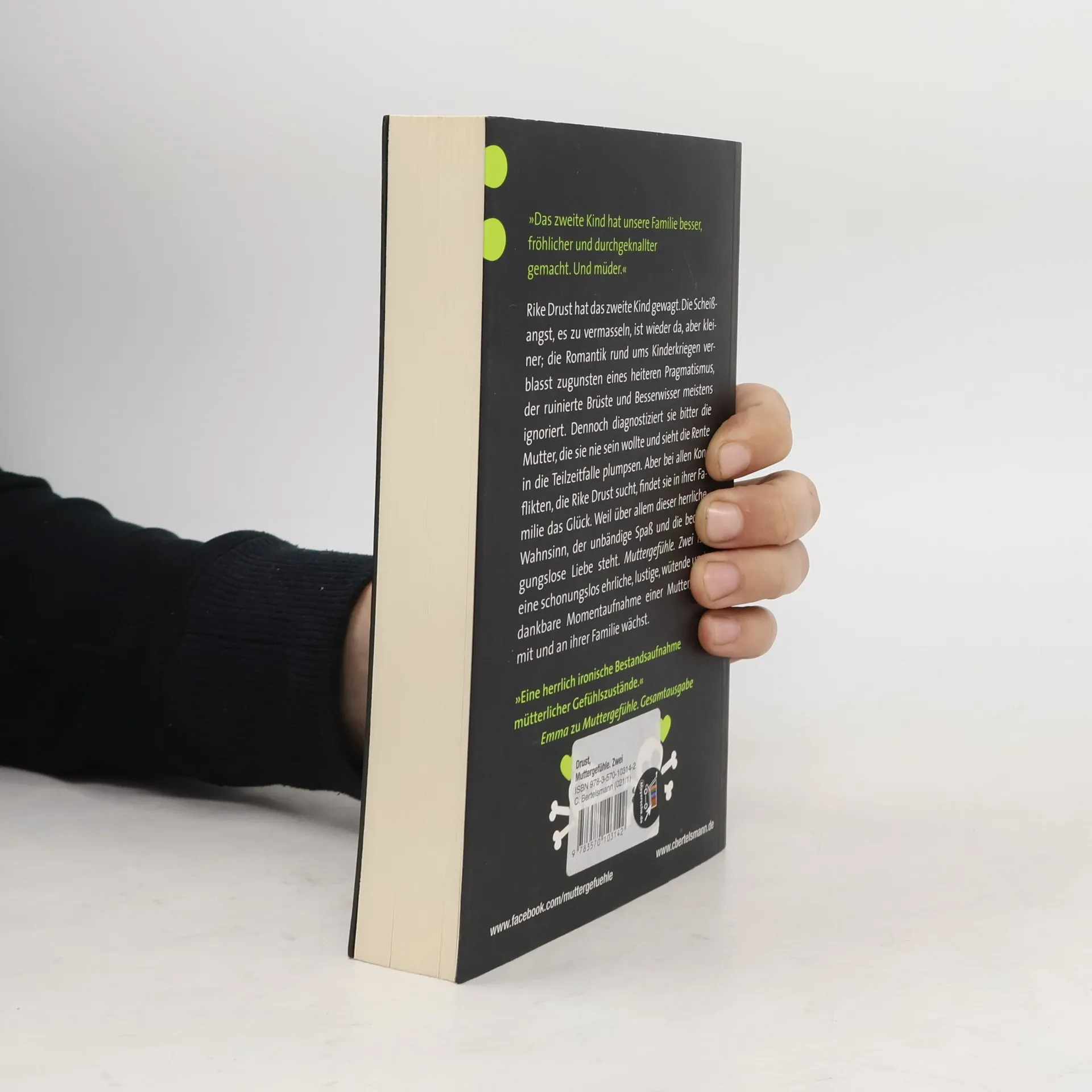 Wenn das zweite Kind auf dem Weg ist! Dieses Buch ist der Vorbereitungskurs und das ideale Geschenk für Mütter, die das zweite Kind erwarten. Rike Drust sagt: „Das zweite Kind hat unsere Familie besser, fröhlicher und durchgeknallter gemacht. Und müder.“ Ihr erstes Buch Muttergefühle. Gesamtausgabe spricht Müttern aus der Seele: unverblümt, selbstironisch, provokant. Nun hat Rike Drust das zweite Kind gewagt. Die Scheißangst, es zu vermasseln, ist wieder da, aber kleiner; die Romantik rund ums Kinderkriegen verblasst zugunsten eines heiteren Pragmatismus, der ruinierte Brüste und Besserwisser meistens ignoriert. Dennoch diagnostiziert sie bitter die Mutter, die sie nie sein wollte, sieht die Rente in die Teilzeitfalle plumpsen und scheitert regelmäßig am Vereinbarkeitsspagat sowie an den Erwartungen ihrer Familie, an theoretischen Erziehungskonzepten und immer wieder ihren eigenen. Aber bei allen Konflikten, die Rike Drust sucht, findet sie in ihrer Familie das Glück. Weil über allem dieser herrliche Wahnsinn, der unbändige Spaß und die bedingungslose Liebe steht. Muttergefühle. Zwei ist eine schonungslos ehrliche, lustige, wütende und dankbare Momentaufnahme einer Mutter, die mit und an ihrer Familie wächst.