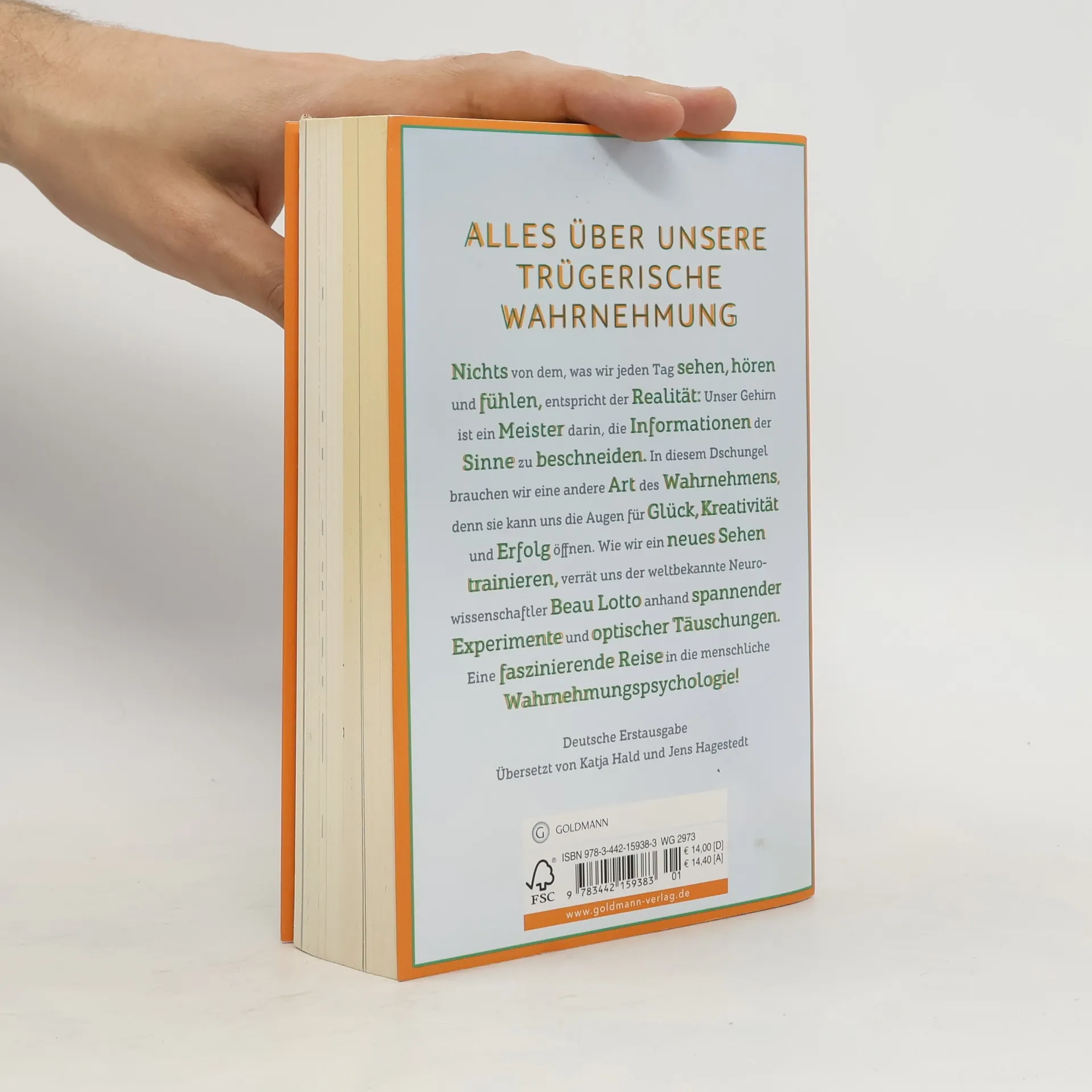 Du siehst was, was du nicht siehst Was wir sehen, hören, fühlen, entspricht nicht der Realität. Wahrnehmung ist die Grundlage aller menschlicher Erfahrung, und sie trügt, wo sie nur kann. Darum will der weltbekannte Neurowissenschaftler Beau Lotto nichts Geringeres, als uns eine neue Art des Wahrnehmens zu ermöglichen, denn dies ist der Schlüssel zu Glück und Erfolg. Wir sollen nicht nur verstehen, sondern wirklich erleben, wie unser Gehirn die Informationen der Sinne beschneidet. Dazu kombiniert der Autor spannende Geschichten, eigene Experimente und optische Täuschungen zum Selbsttest. Auf seine originelle, humorvolle und anschauliche Weise lässt uns Beau Lotto am eigenen Leib unsere Wahrnehmung wahrnehmen und somit auf die nächste Stufe heben. Ausstattung: mit s/w-Abbildungen