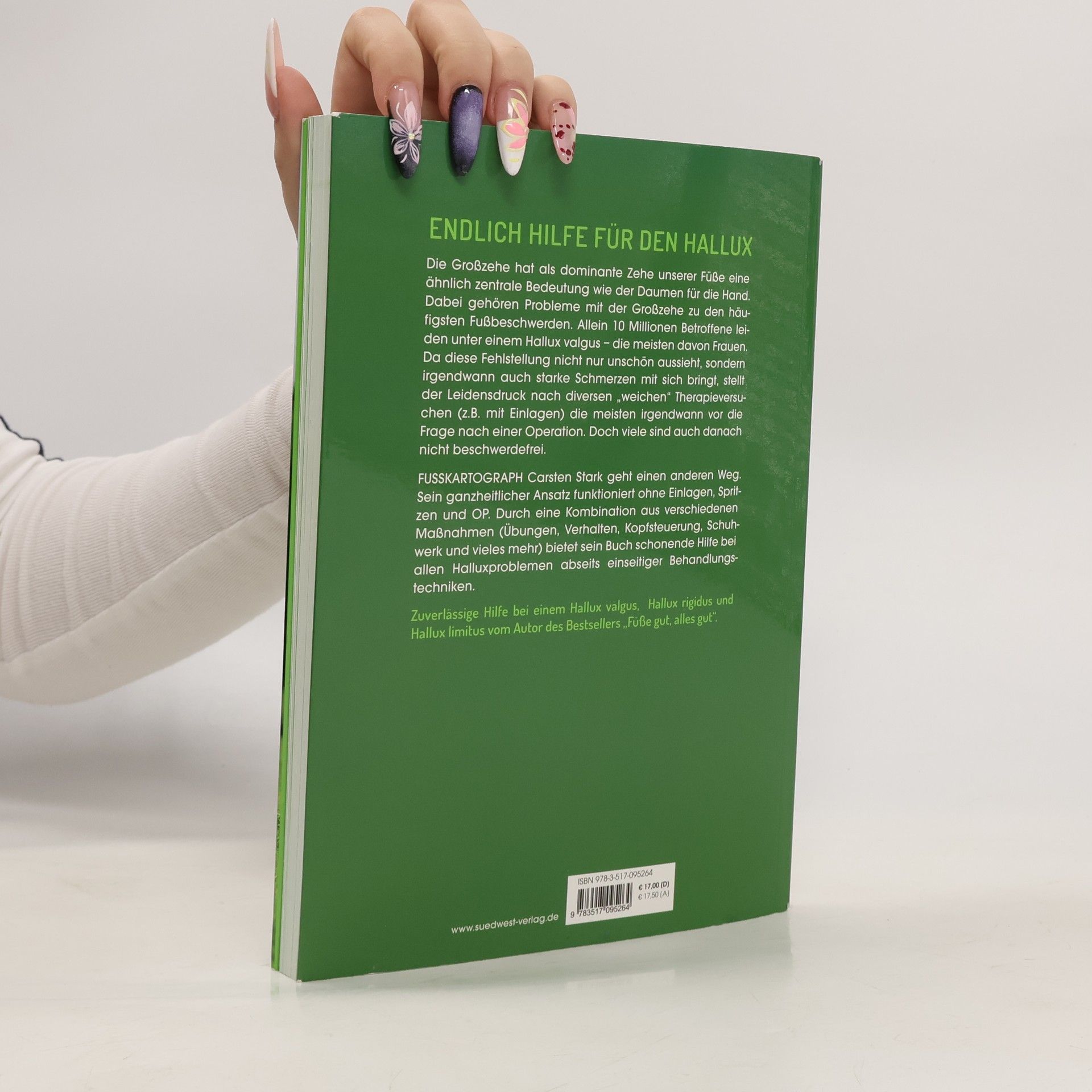 Endlich Hilfe für den Hallux! 10 Mio. Betroffene leiden unter einem Hallux valgus. Da diese Fehlstellung nicht nur unschön aussieht, sondern irgendwann auch starke Schmerzen mit sich bringt, stellt der Leidensdruck die meisten irgendwann vor die Entscheidung: Operation, ja oder nein. Carsten Starks ganzheitlicher Ansatz funktioniert ohne Einlagen, Spritzen und OP. Durch eine Kombination verschiedener Maßnahmen bietet er schonende Hilfe bei Problemen mit dem Hallux valgus, dem Hallux rigidus und dem Hallux limitus. Ausstattung: ca. 60 Farbfotos und farbige Abbildungen