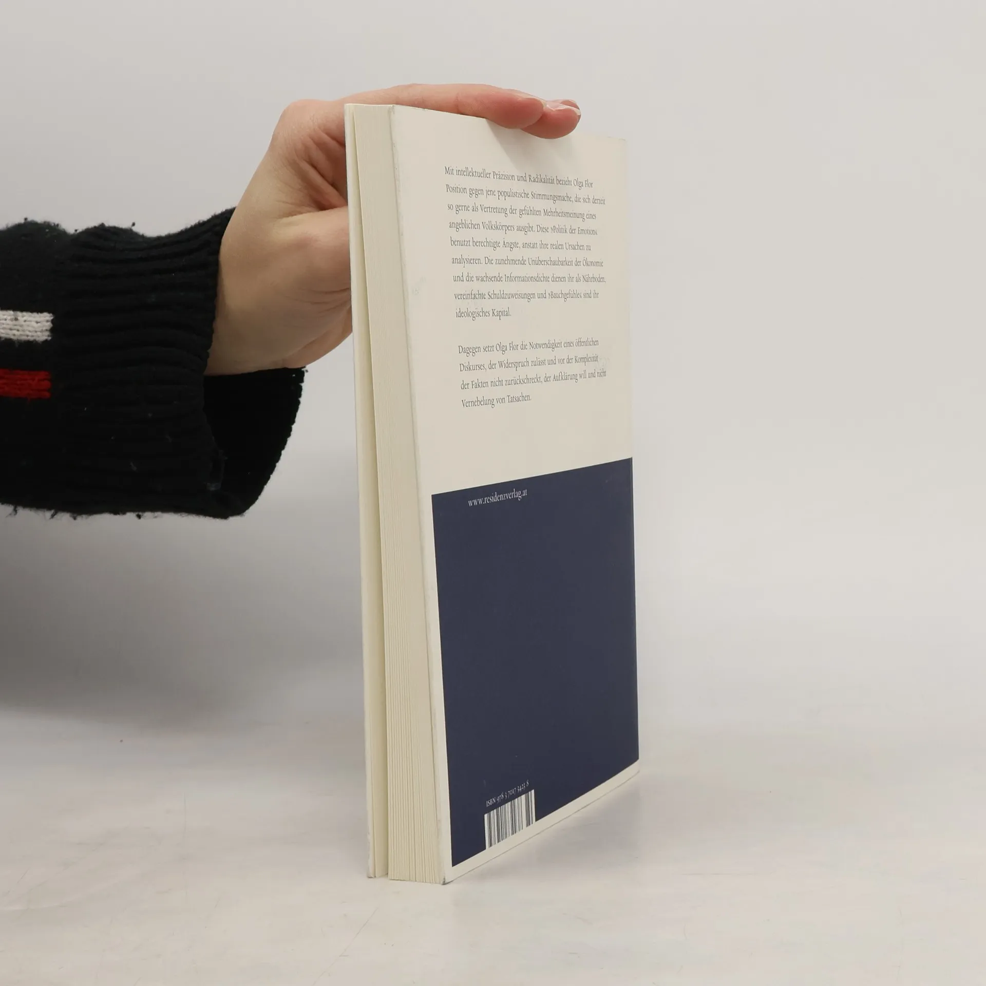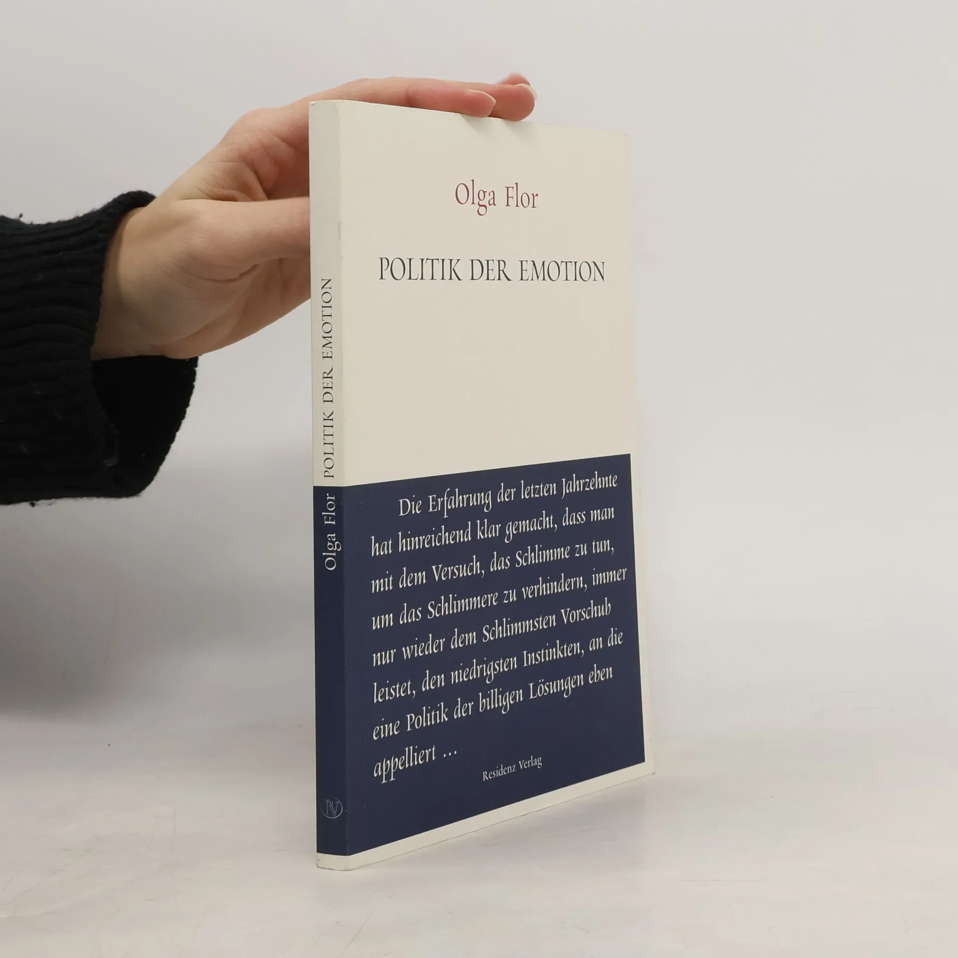 Mit intellektueller Präzision und Radikalität bezieht Olga Flor Position gegen jene populistische Stimmungsmache, die sich derzeit so gerne als Vertretung der gefühlten Mehrheitsmeinung eines schwammig definierten Volkskörpers ausgibt. Diese „Politik der Emotion“ benutzt berechtigte Ängste, anstatt ihre realen Ursachen zu analysieren. Die zunehmende Unüberschaubarkeit der Ökonomie und die wachsende Informationsdichte dienen ihr als Nährboden, vereinfachte Schuldzuweisungen und „Bauchgefühle“ sind ihr ideologisches Kapital. Dagegen setzt Olga Flor die Notwendigkeit eines öffentlichen Diskurses, der Widerspruch zulässt und vor der Komplexität der Fakten nicht zurückschreckt, der Aufklärung will und nicht Vernebelung von Tatsachen.