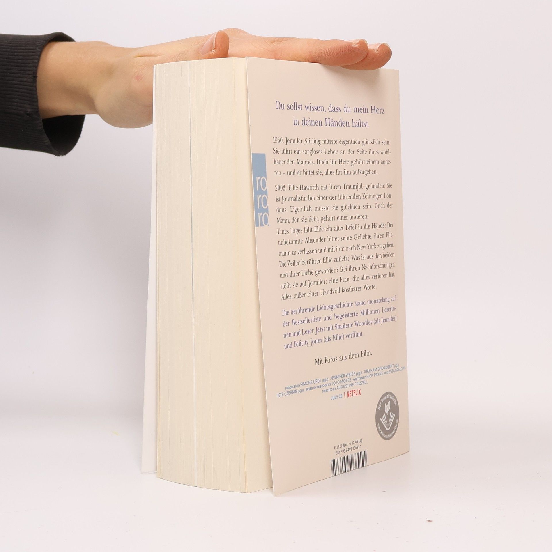 Eine dramatische Liebesgeschichte aus der Feder von Bestsellerautorin Jojo Moyes über die Leidenschaft, die Worte entfachen können, und die Kraft einer Liebe, die Jahrzehnte und Schicksalsschläge überdauert. Prominent verfilmt - mit Shailene Woodley, Felicity Jones und Callum Turner.  1960. Jennifer Stirling müsste eigentlich glücklich sein: Sie führt ein sorgloses Leben an der Seite ihres wohlhabenden Mannes. Doch ihr Herz gehört einem anderen – und er bittet sie, alles für ihn aufzugeben. 2003. Ellie Haworth hat ihren Traumjob gefunden: Sie ist Journalistin bei einer der führenden Zeitungen Londons. Eigentlich müsste sie glücklich sein. Doch der Mann, den sie liebt, gehört einer anderen. Eines Tages fällt Ellie ein jahrzehntealter Liebesbrief in die Hände: In leidenschaftlichen Worten bittet der unbekannte Absender seine Geliebte, ihren Ehemann zu verlassen und mit ihm nach New York zu gehen. Als Ellie diese Zeilen liest, ist sie erschüttert. Was ist aus den beiden und ihrer Liebe geworden? Sie stellt Nachforschungen an und stößt auf Jennifer: eine Frau, die alles verloren hat. Alles, außer einer Handvoll kostbarer Worte. Mit Fotos aus dem Film im Innenteil.