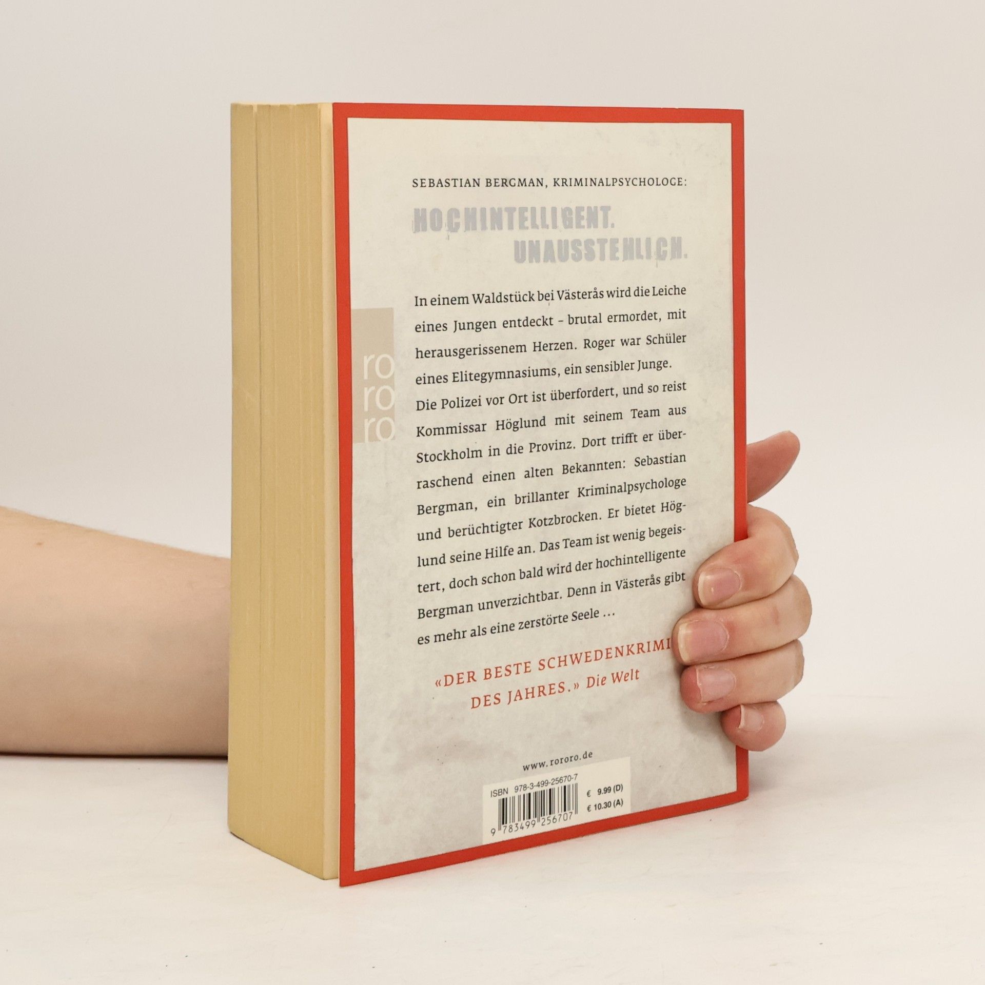 Sebastian Bergman, Kriminalpsychologe: Hochintelligent. Unausstehlich. In einem Waldstück bei Västerås wird die Leiche eines Jungen entdeckt – brutal ermordet, mit herausgerissenem Herzen. Roger war Schüler eines Elitegymnasiums, ein sensibler Junge. Die Polizei vor Ort ist überfordert, und so reist Kommissar Höglund mit seinem Team aus Stockholm in die Provinz. Dort trifft er überraschend einen alten Bekannten: Sebastian Bergman, ein brillanter Kriminalpsychologe und berüchtigter Kotzbrocken. Er bietet Höglund seine Hilfe an. Das Team ist wenig begeistert, doch schon bald wird der hochintelligente Bergman unverzichtbar. Denn in Västerås gibt es mehr als eine zerstörte Seele ... Sebastian Bergmans erster Fall