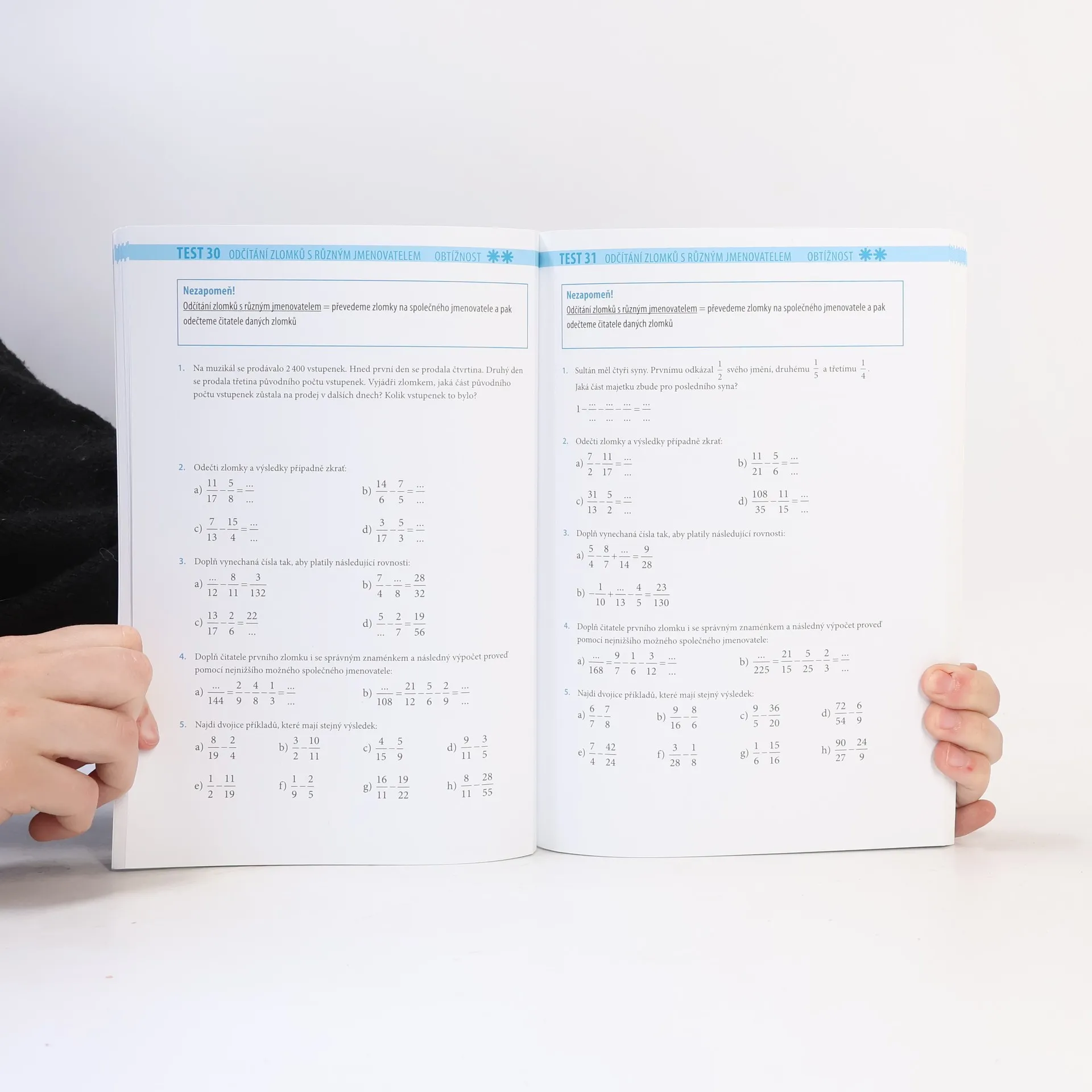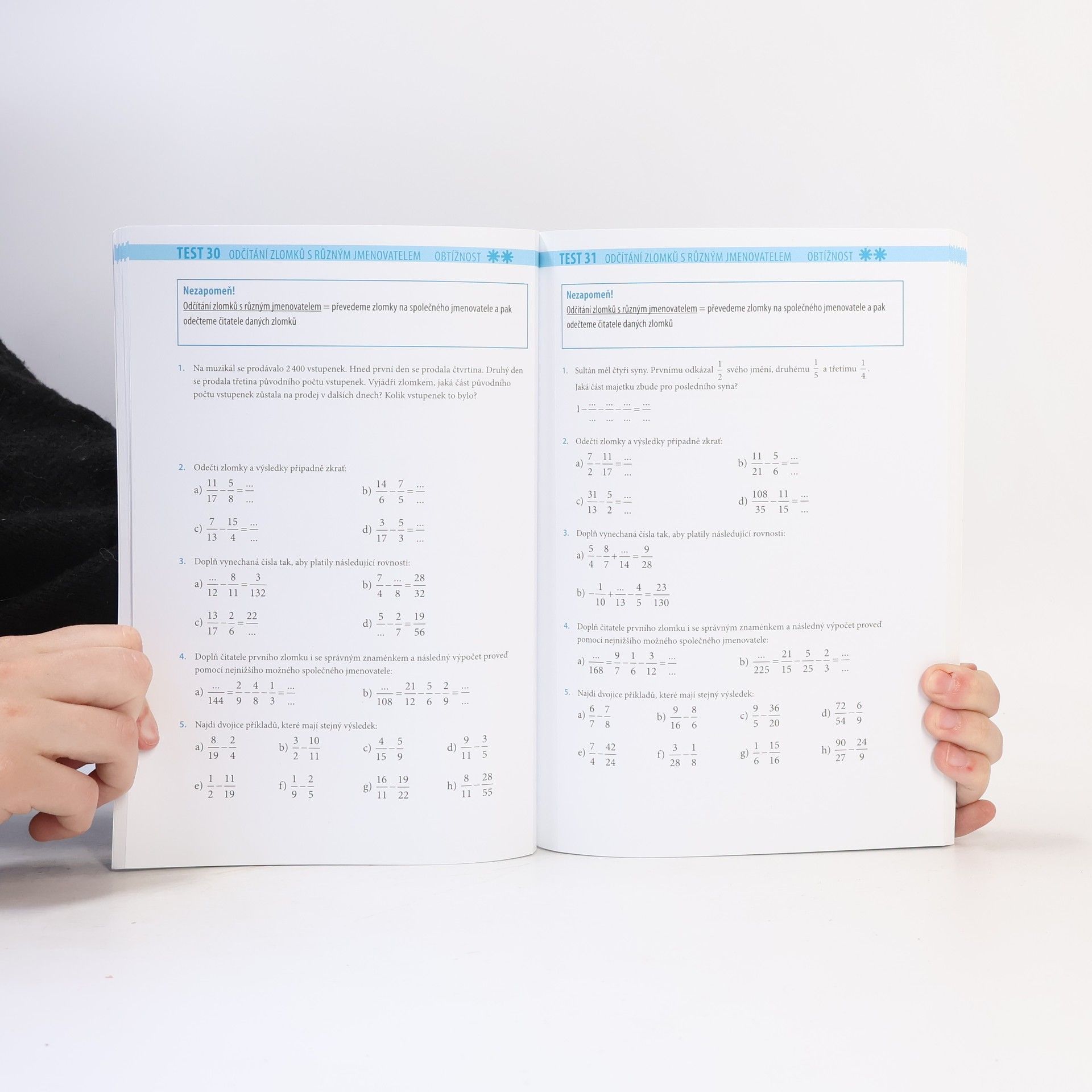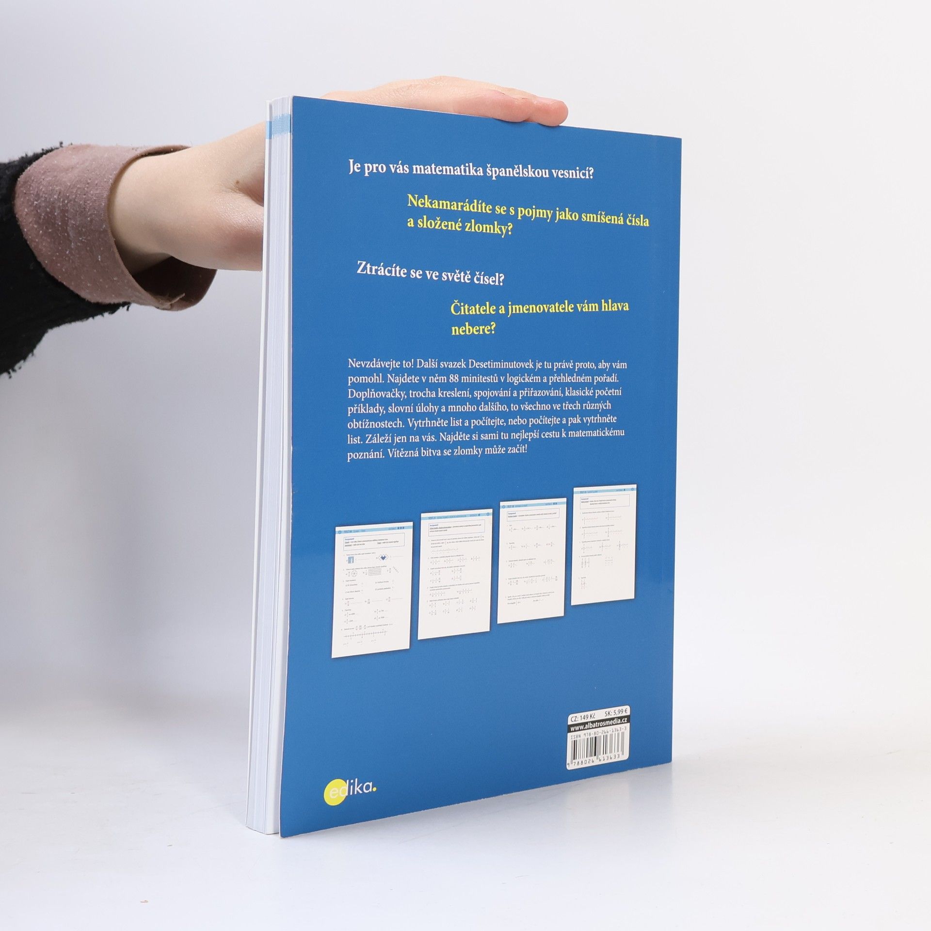 V dalším svazku Desetiminutovek najdete 88 minitestů v logickém a přehledném pořadí. Rozšiřování, krácení, porovnávání zlomků, počítání se zlomky se stejným i rozdílným jmenovatelem, slovní úlohy a mnoho dalšího, to vše ve třech různých obtížnostech. Vytrhněte list a počítejte, nebo počítejte a pak list vytrhněte. Záleží jen na vás! Najděte si cestu k matematickému poznání, která vám nejvíc vyhovuje. Vítězná bitva se zlomky může začít!