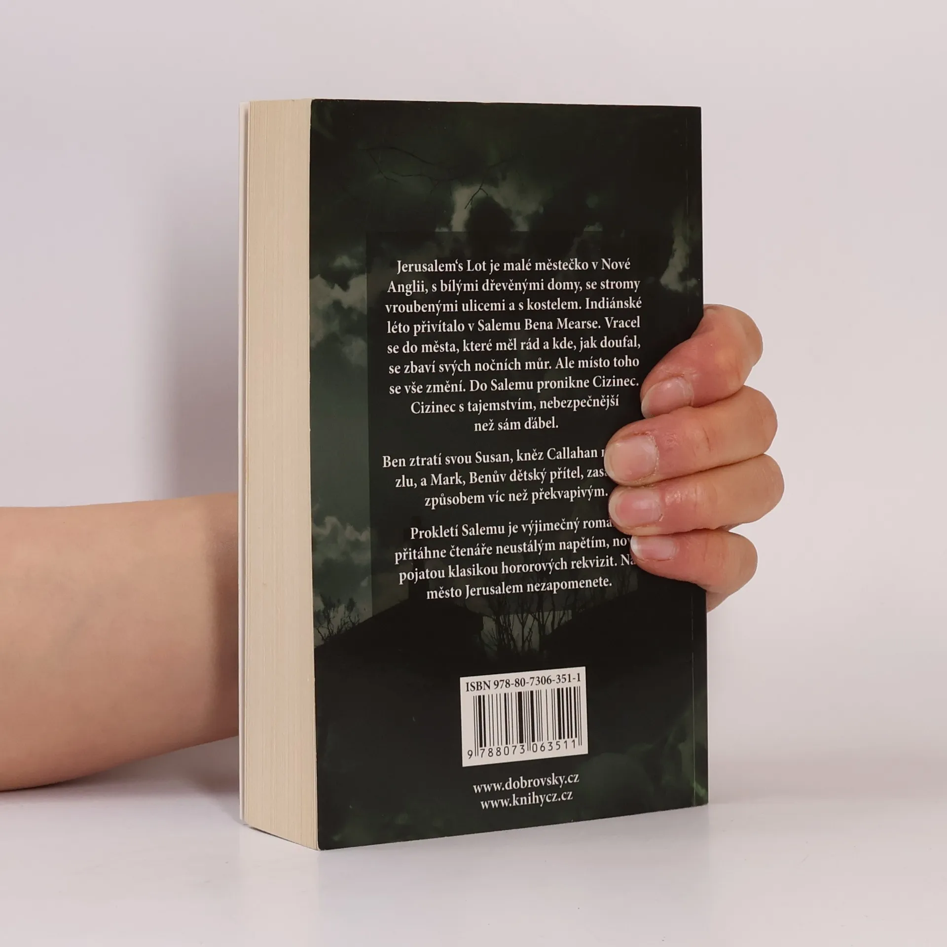 Jerusalem's Lot je poklidné městečko v Nové Anglii. Jenže pod jeho starosvětskou slupkou se skrývá zlo, které jen čeká na to, aby je někdo probudil. Každý něco skrývá, všichni tu mají na duši škraloup. Duchovní, otec Callahan, nezřízeně pije a v Bohu už nevěří, sedmnáctiletá Sandy McDougallová bije své roční dítě, když zlobí, Bonne Sawyerová je muži nevěrná prakticky s každým, koho potká. A k tomu všemu na město z kopce shlíží opuštěný a strašidelný Marstenův dům, který zničehonic začal někdo obývat. A nikdo netuší, že právě odtud v podobě upíra, pana Barlowa, a jeho pomocníka Strakera přichází apokalyptická zkáza. Nejméně ze všech pak průměrný spisovatel thrillerů Ben Mears, jenž se do Salemu po letech vrací, aby tu našel ztracený klid... Raný Kingův román Prokletí Salemu buduje dusivou atmosféru hrůzy postupně a v hypnoticky pomalém tempu. Nečekejte happy end, nečekejte jednoznačné rozdělení na dobro a zlo, protože nejhorším zlem není člověku nadpřirozená bytost, ale on sám.