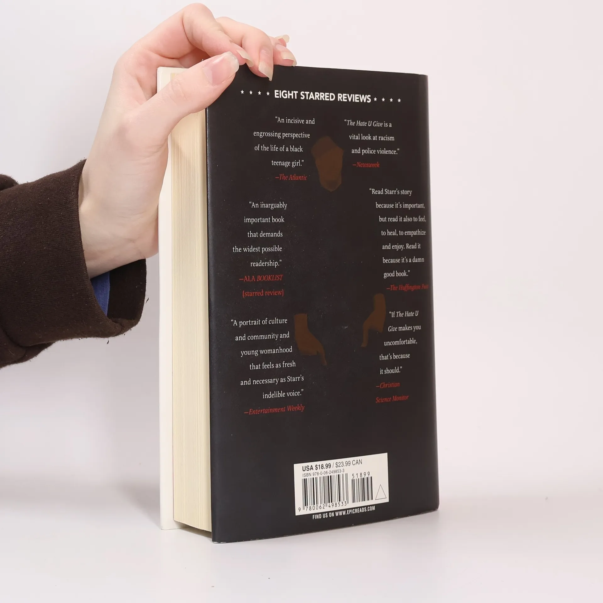 8 starred reviews ∙ William C. Morris Award Winner ∙ National Book Award Longlist ∙ Printz Honor Book ∙ Coretta Scott King Honor Book ∙ #1 New York Times Bestseller! "Absolutely riveting!" —Jason Reynolds "Stunning." —John Green "This story is necessary. This story is important." —Kirkus (starred review) "Heartbreakingly topical." —Publishers Weekly (starred review) "A marvel of verisimilitude." —Booklist (starred review) "A powerful, in-your-face novel." —Horn Book (starred review) Sixteen-year-old Starr Carter moves between two worlds: the poor neighborhood where she lives and the fancy suburban prep school she attends. The uneasy balance between these worlds is shattered when Starr witnesses the fatal shooting of her childhood best friend Khalil at the hands of a police officer. Khalil was unarmed. Soon afterward, his death is a national headline. Some are calling him a thug, maybe even a drug dealer and a gangbanger. Protesters are taking to the streets in Khalil’s name. Some cops and the local drug lord try to intimidate Starr and her family. What everyone wants to know is: what really went down that night? And the only person alive who can answer that is Starr. But what Starr does—or does not—say could upend her community. It could also endanger her life. And don't miss On the Come Up, Angie Thomas's powerful follow-up to The Hate U Give.