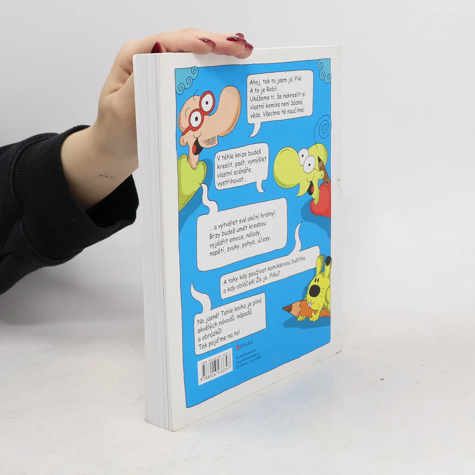 Mají vaše děti rády komiksy a rády kreslí? Pak je pro ně tato kniha plná zábavy i ponaučení jako stvořená! Děti se podle ní naučí hravou formou základy tvorby komiksu, jeho zákonitosti, používané prvky a jevy. Mohou do ní kreslit, psát, vytvářet vlastní scénáře, vystřihovat, čmárat a dělat cokoli, co jim umožní nakreslit si svůj vlastní a jedinečný příběh. Na 240 stranách autoři vysvětlí základní postupy, naučí děti vytvořit své akční hrdiny, kresbou vyjadřovat emoce, nálady, napětí, zvuky, pohyb, účesy.