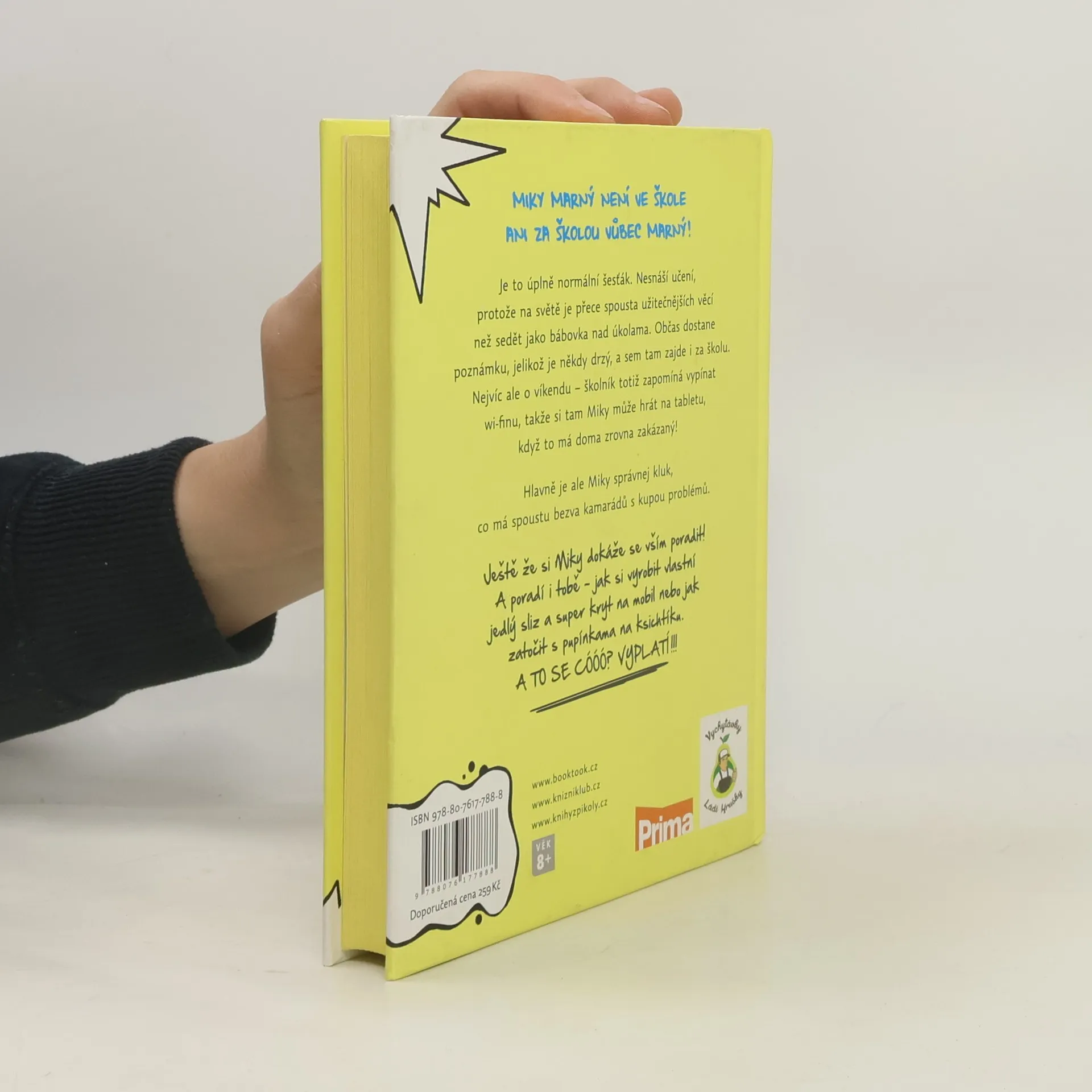 Miky Marný není ve škole ani za školou vůbec marný! Je to úplně normální šesťák. Nesnáší učení, protože na světě je přece spousta užitečnějších věcí než sedět jako bábovka nad úkolama. Občas dostane poznámku, jelikož je někdy drzý, a sem tam zajde i za školu. Nejvíc ale o víkendu – školník totiž zapomíná vypínat wi-finu, takže si tam Miky může hrát na tabletu, když to má doma zrovna zakázaný! Hlavně je ale Miky správnej kluk, co má spoustu bezva kamarádů s kupou problémů. Ještě že si Miky dokáže se vším poradit! A poradí i tobě –jak si vyrobit vlastní jedlý sliz a super kryt na mobil nebo jak zatočit s pupínkama na ksichtíku. A to se cóóó? Vyplatí!!! Kniha je určená čtenářům od 8 let.
