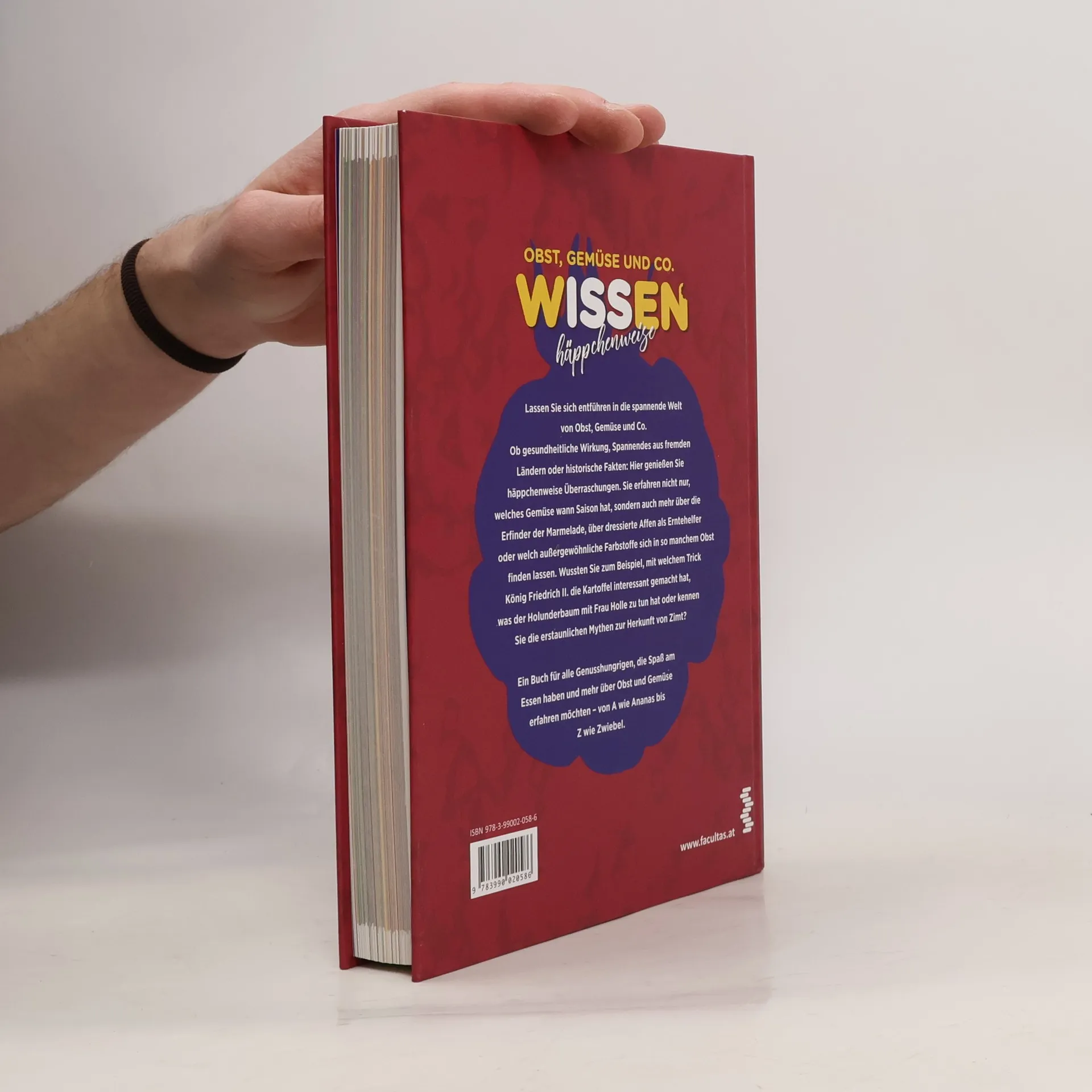 Lassen Sie sich entführen in die spannende Welt von Obst, Gemüse und Co. Ob gesundheitliche Wirkung, Spannendes aus fremden Ländern oder historische Fakten: Hier genießen Sie häppchenweise Überraschungen. Sie erfahren nicht nur, welches Gemüse wann Saison hat, sondern auch mehr über die Erfinder der Marmelade, über dressierte Affen als Erntehelfer oder welch außergewöhnliche Farbstoffe sich in so manchem Obst finden lassen. Wussten Sie zum Beispiel, mit welchem Trick König Friedrich II. die Kartoffel interessant gemacht hat, was der Holunderbaum mit Frau Holle zu tun hat oder kennen Sie die erstaunlichen Mythen zur Herkunft von Zimt? Ein Buch für alle Genusshungrigen, die Spaß am Essen haben und mehr über Obst und Gemüse erfahren möchten – von A wie Ananas bis Z wie Zwiebel.