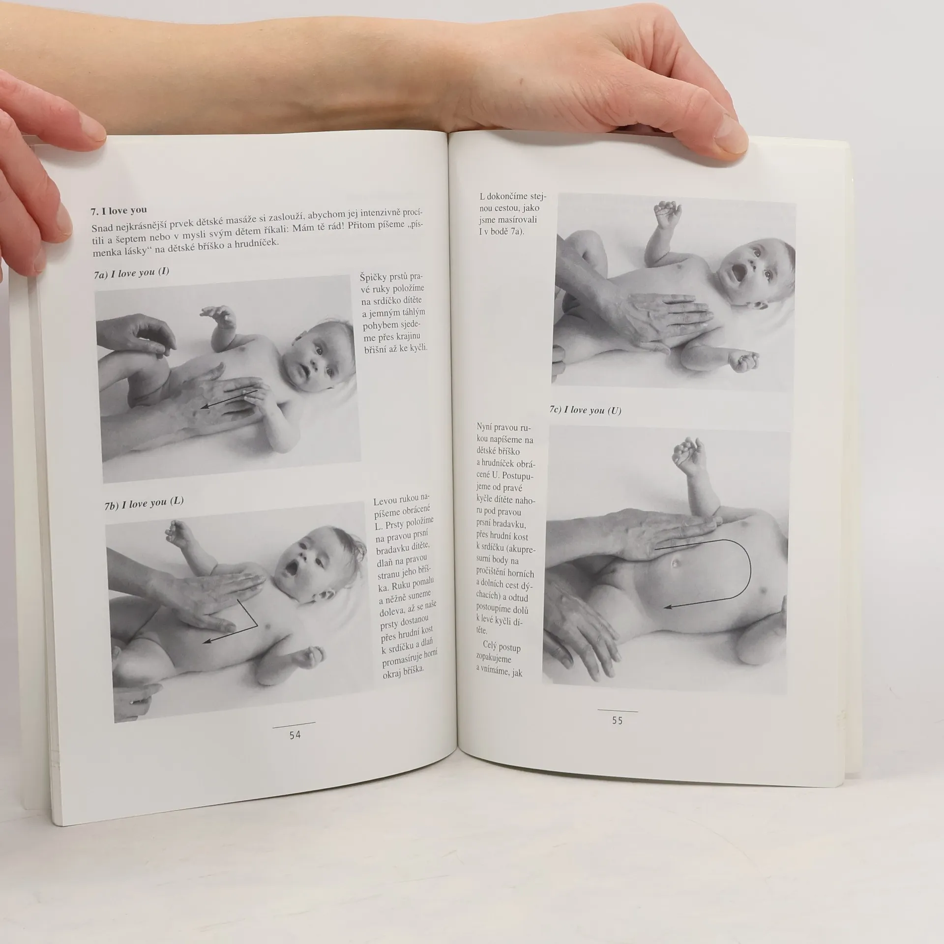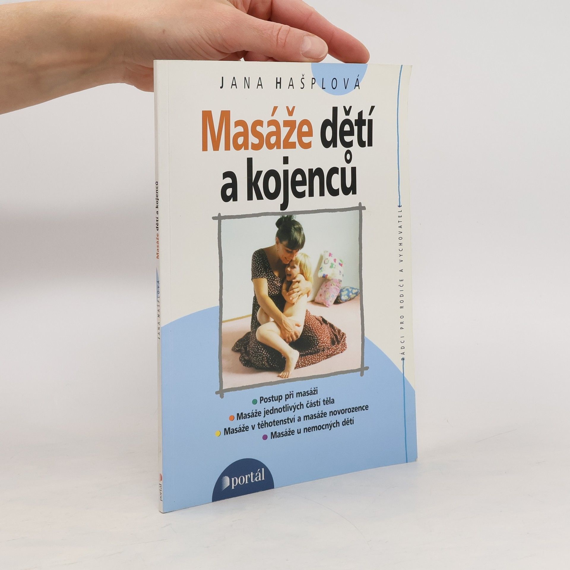 Postup při masáži, masáže jednotlivých částí těla, masáže v těhotenství a masáže novorozence, masáže u nemocných dětí. Názorné a přehledné uvedení do techniky masáží dětí a kojenců určené ať už pro výukové kurzy, pro profesionální pracovníky i pro samotné rodiče. Po teoretickém uvedení do problematiky masáží (účinnost masáží u zdravých i nemocných dětí, význam doteku jako součásti komunikace s dítětem, souvislosti a aroma- a muzikoterapií...) tvoří jádro knihy vlastní technika masáže, jež je ilustrována na cca. 75 fotografiích, které zájemcům pomohou osvojit si vlastní postup.