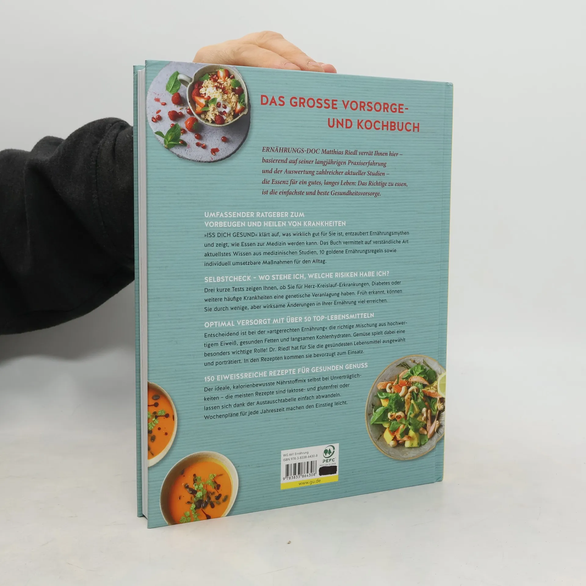 Das große Vorsorge- und Gesundheitskochbuch von ERNÄHRUNGS-DOC Matthias Riedl Gesund essen ist die einfachste und beste Vorsorge für ein langes, beschwerdefreies Leben. ERNÄHRUNGS-DOC Dr. Riedl vermittelt aktuelles Ernährungswissen auf unkomplizierte und anschauliche Art. Welche Lebensmittel sind gesund und warum? Wie muss ich essen, damit ernährungsabhängige Krankheiten wie Diabetes, Bluthochdruck oder Arthrose erst gar nicht entstehen? Ein Selbstcheck hilft, individuelle Risiken zu erkennen und zeigt den Weg zu einer gesünderen Ernährung mit genauem Aktionsplan. Das Gesundheitskochbuch enthält rund 150 alltagstaugliche, vitalstoffreiche und kalorienbewusste Rezepte plus Hinweise auf gesundheitliche Benefits. Außerdem gibt es praktische Tipps für die Umsetzung im Alltag wie Wochenpläne, Warenkunde und Küchenpraxis. Von Frühstück, Dips & Snacks über Hauptspeisen mit Fleisch, Fisch und Vegetarischem bis hin zu Desserts, Brot, Kuchen und Getränken. So lässt es sich für die ganze Familie gesundheitsbewusst und genussvoll kochen – selbst bei Unverträglichkeiten!
