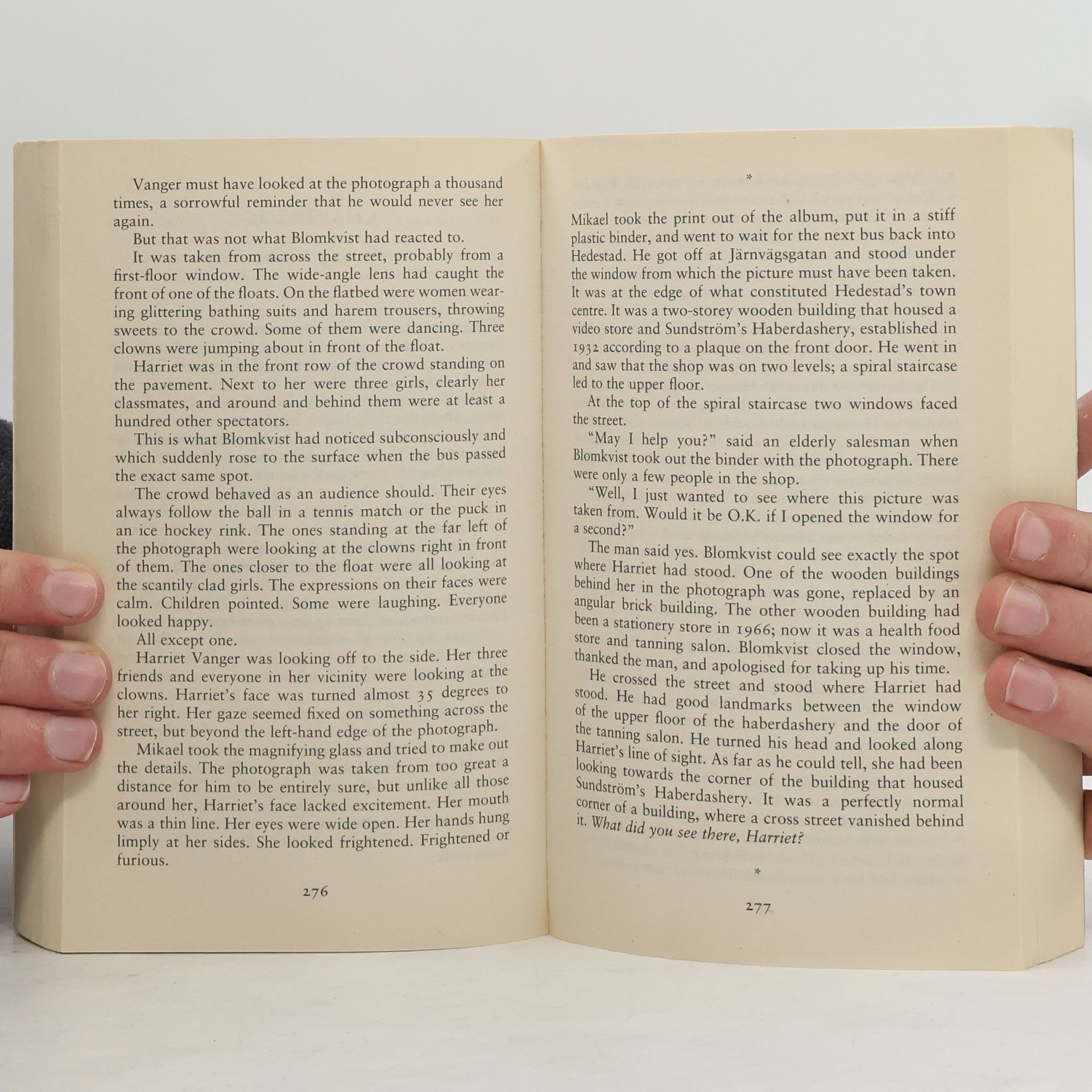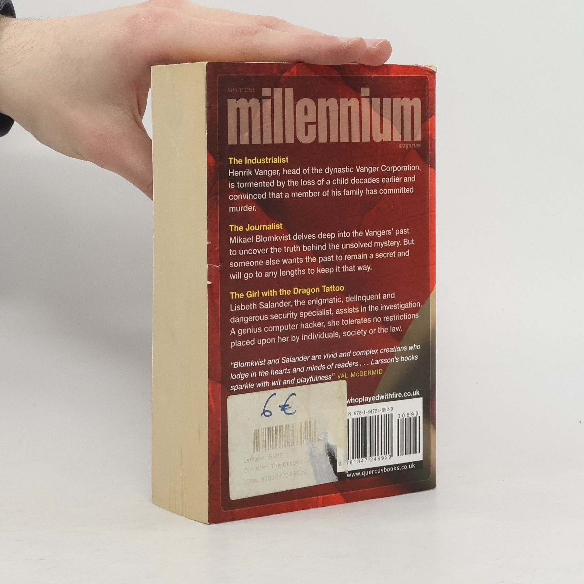 The Industrialist: Henrik Vanger, head of the dynastic Vanger Corp. is tormented by the loss of a child decades earlier and convinced that a member of his family committed murder. The Journalist: Mikael Blomkvist delves deep into the Vangers' past to uncover the truth behind the unsolved mystery. But someone else wants the past to remain a secret and will go to any lengths to keep it that way. The girl with the Dragon Tattoo: Lisbeth Salander, the enigmatic, delinquent and dangerous security specialist, assists in the investigation. A genius computer hacker, she tolerates no restrictions placed upon her by individual, society or the law. (back cover)