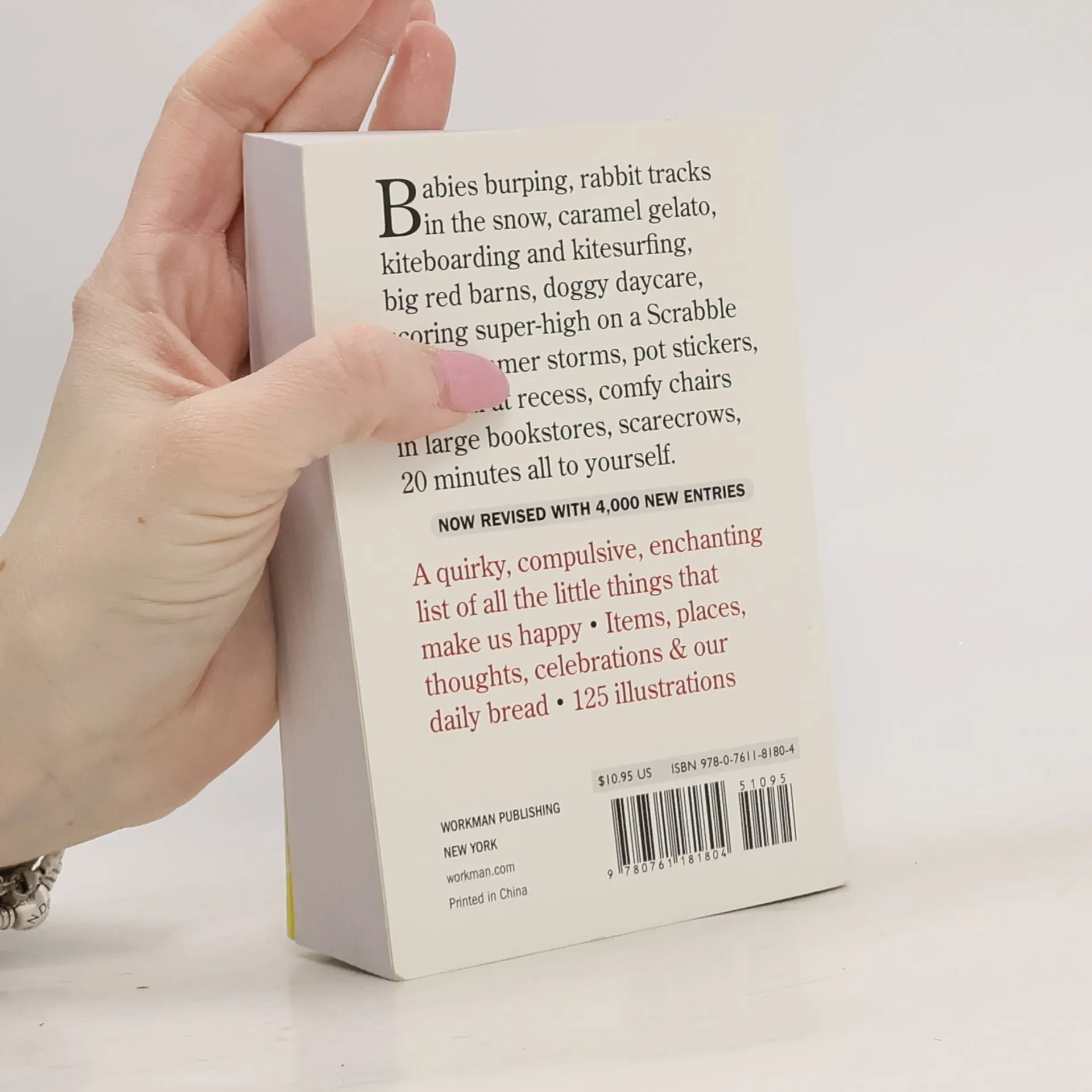 Something to be happy about: This mesmerizing bestseller is revised and updated. Originally published 25 years ago (happy anniversary!) from a list that Barbara Ann Kipfer started making as a child, it’s the book that marries obsession with happiness. And it now has 4,000 fresh and more current reasons to be happy: Rabbit tracks in the snow. Kiteboarding and kitesurfing. Caramel gelato. Scoring super-high on a Scrabble turn. Babies burping. Summer storms. White cupcakes with multicolored sprinkles. Big red barns. 20 minutes all to yourself. No opinions, no explanations, no asides, no footnotes, editorializing, or proselytizing. Just the simple premise of a list of things that make us smile. With its chunky shape, striking black-and-white cover, and 100 whimsical illustrations by Pierre Le-Tan, the new 14,000 Things is an irresistible catalog of good thoughts completely updated to reflect today’s world—and an uplifting gift for people of all moods and all ages.