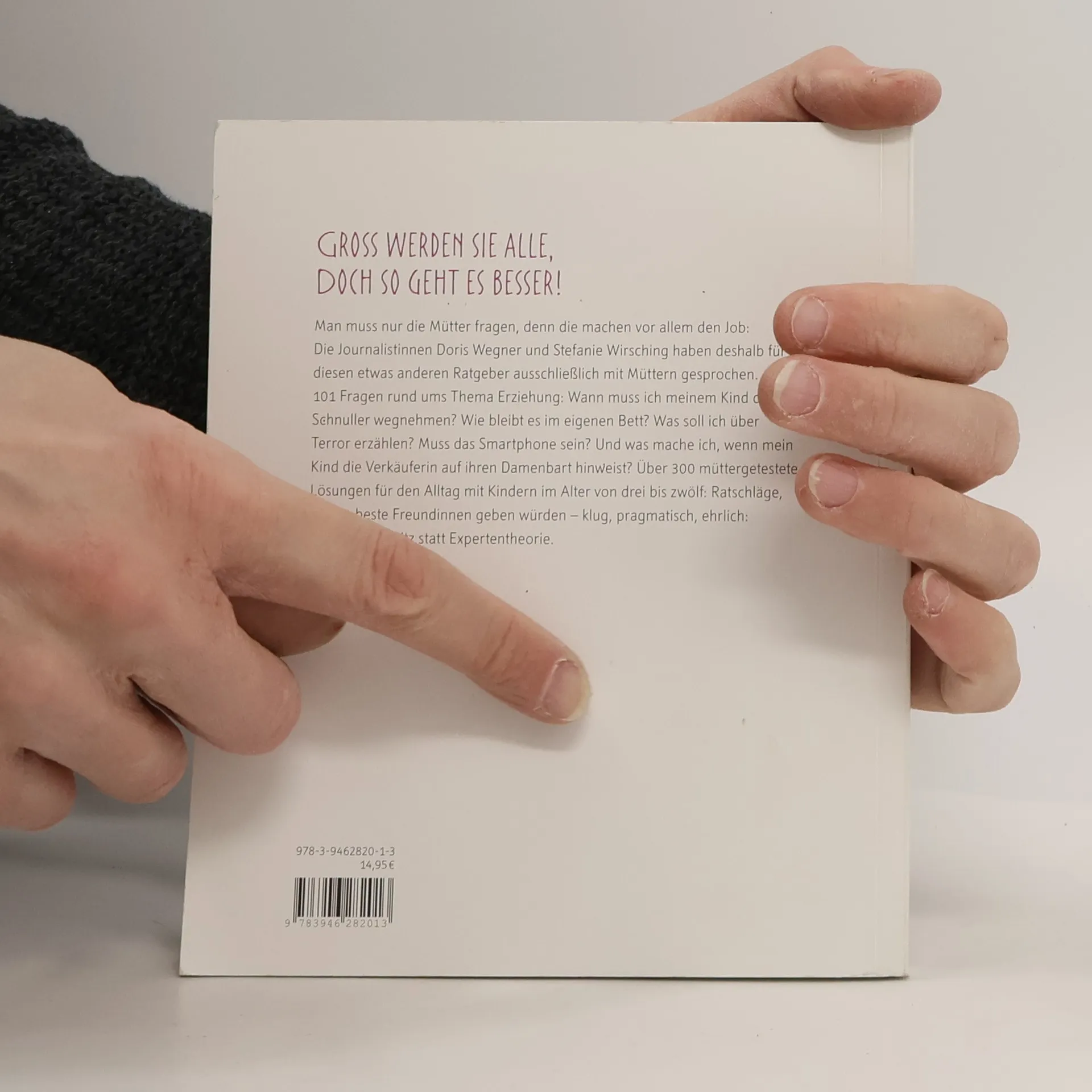 Groß werden Kinder alle, doch es geht so besser - wie dieser etwas andere Erziehungsratgeber beweist. Man muss nur die Mütter fragen, denn die machen den Job ja vor allem: Die Journalistinnen Doris Wegner und Stefanie Wirschung haben deshalb für dieses buch ausschließlich mit Müttern gesprochen. Und sie haben endlich ehrliche Antworten aus deren Trickkiste erhalten. 101 Fragen rund ums Thema Erziehung galt es zu beantworten: Wann muss ich meinem Kind den Schnuller wegnehmen? Wie bleibt es im eigenen Bett? Was soll ich über Terror erzählen? Muss das Smartphone sein? Und was mache ich, wenn mein Kind die Verkäuferin auf ihren Damenbart hinweist? Das Ergebnis: Über 300 müttergetestete Lösungen für den Alltag mit Kindern im Alter von drei bis zwölf: Ratschläge wie sie beste Freundinnen geben würden - klug, pragmatisch, ehrlich. Eben voller Mutterwitz statt grauer Expertentheorie.