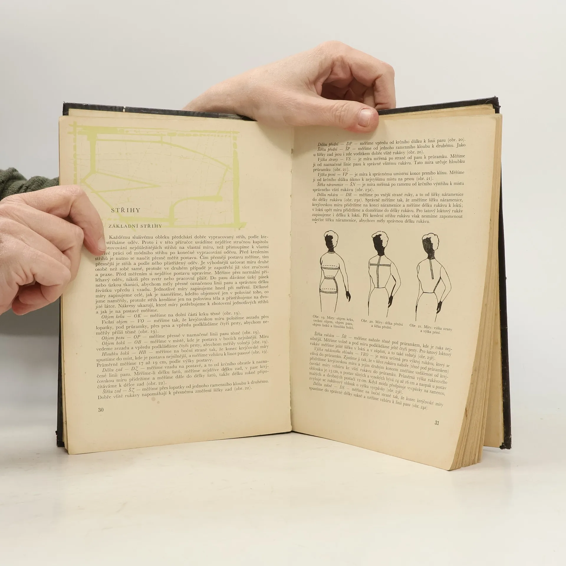 Pomocná kniha pro 1. a 2. roč. prům. školy oděvní v Praze a pro učitelky prací v domácnosti na všeobec. vzdělávacích školách. Podrobný popis jednotlivých pracovních postupů při zhotovování oděvů až ke konečné úpravě hotového výrobku s názornými obrázky. Úvodní kapitoly jsou věnovány nejrůznějším krejčovským pomůckám, seřizování i údržbě šicího stroje a zhotovování základních střihů.