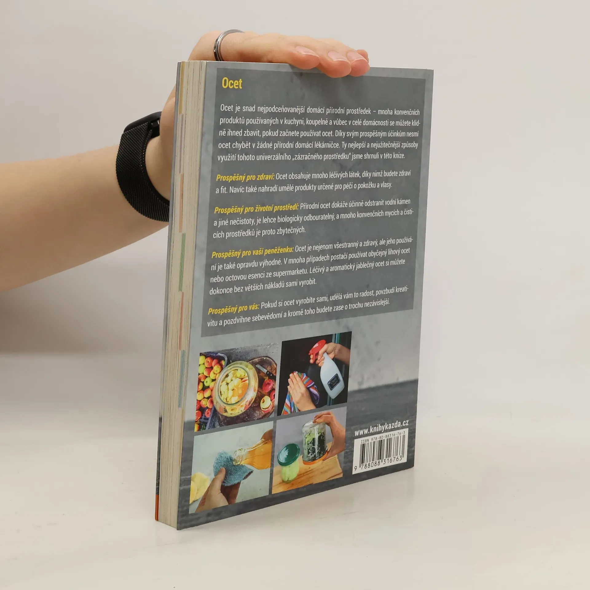,,více než 150 způsobů použití pro zdraví, péči o tělo a ekologickou domácnost.. Ocet je snad nejpodceňovanější domácí přírodní prostředek – mnoha konvenčních produktů používaných v kuchyni, koupelně a vůbec v celé domácnosti se můžete klidně ihned zbavit, pokud začnete používat ocet. Díky svým prospěšným účinkům nesmí ocet chybět v žádné přírodní domácí lékárničce. Ty nejlepší a nejužitečnější způsoby využití tohoto univerzálního „zázračného prostředku“ jsme shrnuli v této knize. Prospěšný pro zdraví: Ocet obsahuje mnoho léčivých látek, díky nimž budete zdraví a fit. Navíc také nahradí umělé produkty určené pro péči o pokožku a vlasy. Prospěšný pro životní prostředí: Přírodní ocet dokáže účinně odstranit vodní kámen a jiné nečistoty, je lehce biologicky odbouratelný, a mnoho konvenčních mycích a čisticích prostředků je proto zbytečných. Prospěšný pro vaši peněženku: Ocet je nejenom všestranný a zdravý, ale jeho používání je také opravdu výhodné. V mnoha případech postačí používat obyčejný lihový ocet nebo octovou esenci ze supermarketu. Léčivý a aromatický jablečný ocet si můžete dokonce bez větších nákladů sami vyrobit. Prospěšný pro vás: Pokud si ocet vyrobíte sami, udělá vám to radost, povzbudí kreativitu a pozdvihne sebevědomí a kromě toho budete zase o trochu nezávislejší.