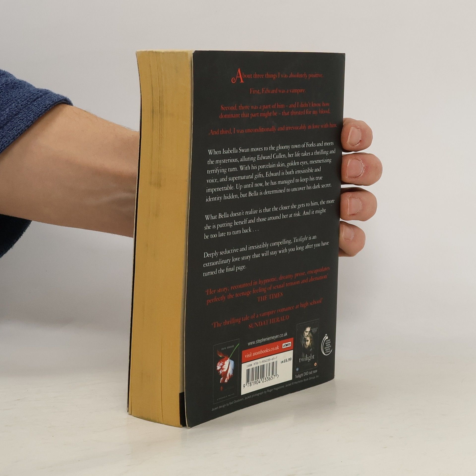 When Isabella Swan moves to the gloomy town of Forks and meets the mysterious, alluring Edward Cullen, her life takes a thrilling and terrifying turn. With his porcelain skin, golden eyes, mesmerizing voice, and supernatural gifts, Edward is both irresistible and impenetrable. Up until now, he has managed to keep his true identity hidden, but Bella is determined to uncover his dark secret. What Bella doesn't realize is that the closer she gets to him, the more she is putting herself and those around her at risk. And it might be too late to turn back ... --back cover