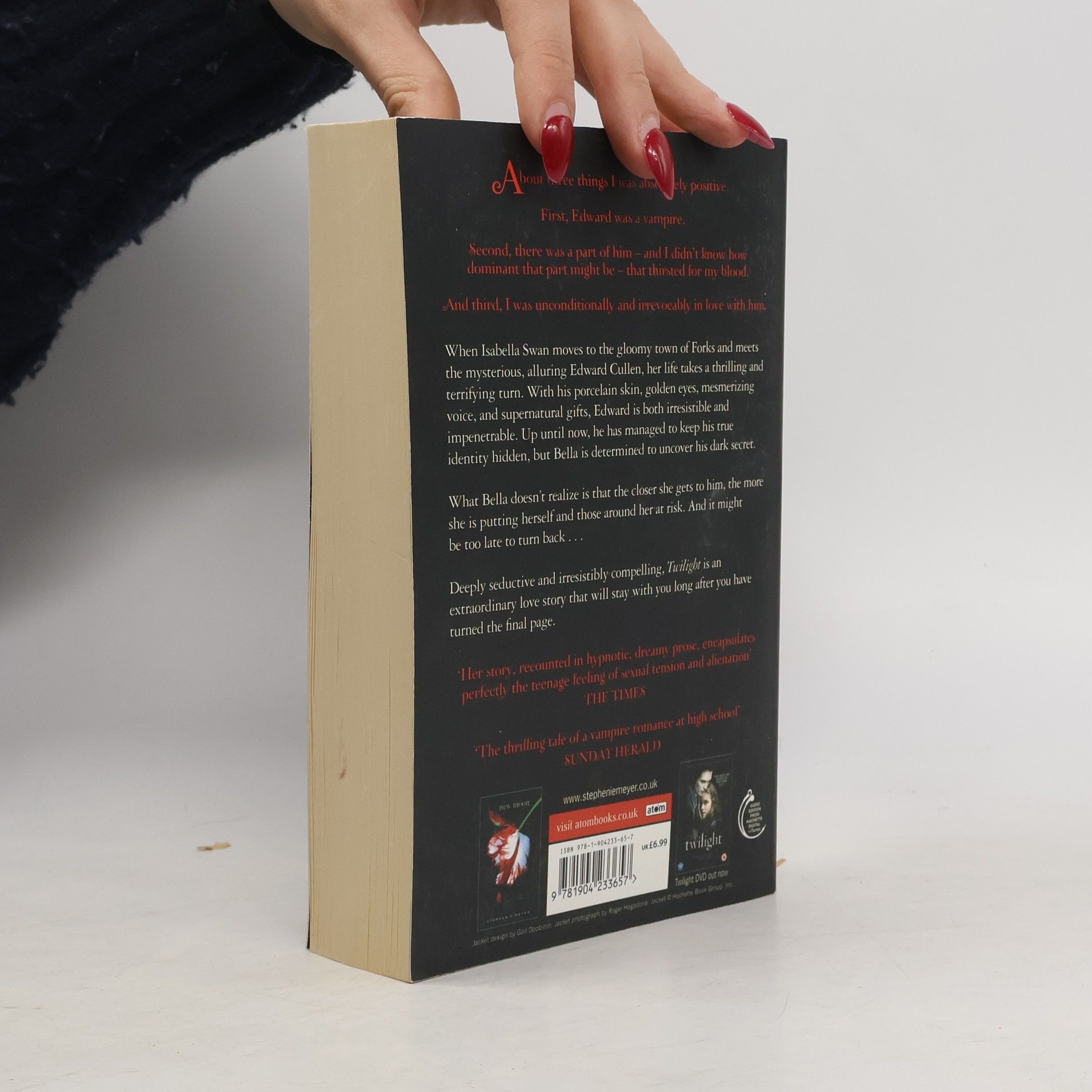 When Isabella Swan moves to the gloomy town of Forks and meets the mysterious, alluring Edward Cullen, her life takes a thrilling and terrifying turn. With his porcelain skin, golden eyes, mesmerizing voice, and supernatural gifts, Edward is both irresistible and impenetrable. Up until now, he has managed to keep his true identity hidden, but Bella is determined to uncover his dark secret. What Bella doesn't realize is that the closer she gets to him, the more she is putting herself and those around her at risk. And it might be too late to turn back ... --back cover
