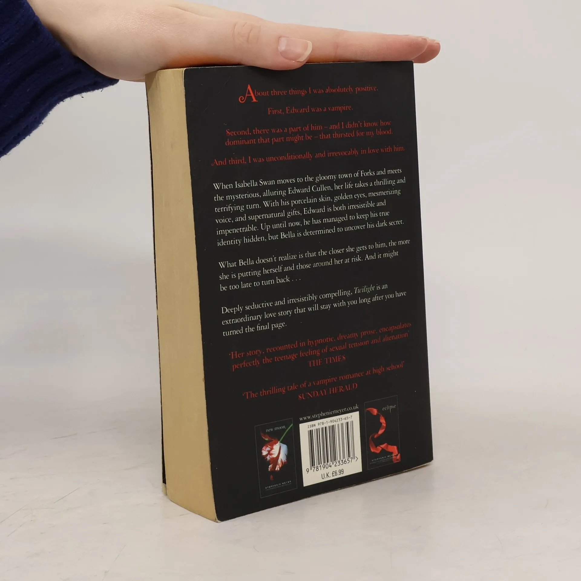When Isabella Swan moves to the gloomy town of Forks and meets the mysterious, alluring Edward Cullen, her life takes a thrilling and terrifying turn. With his porcelain skin, golden eyes, mesmerizing voice, and supernatural gifts, Edward is both irresistible and impenetrable. Up until now, he has managed to keep his true identity hidden, but Bella is determined to uncover his dark secret. What Bella doesn't realize is that the closer she gets to him, the more she is putting herself and those around her at risk. And it might be too late to turn back ... --back cover