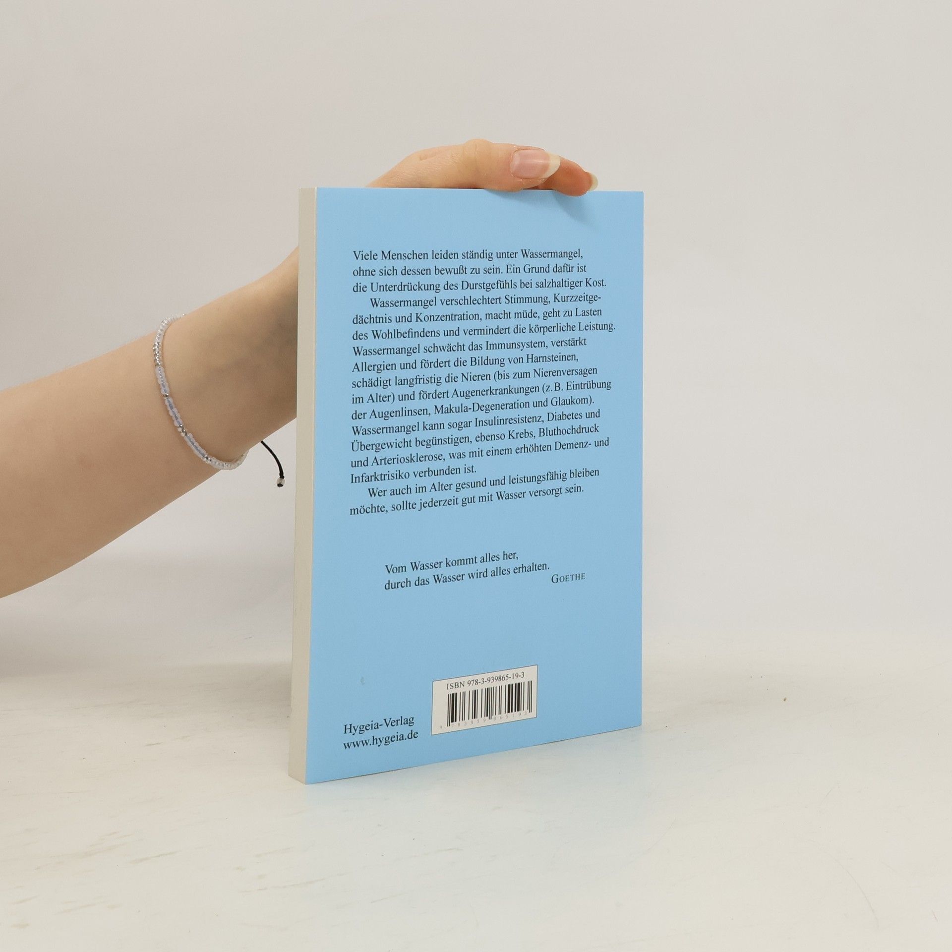 Viele Menschen leiden ständig unter Wassermangel, ohne sich dessen bewußt zu sein. Ein Grund dafür ist die Unterdrückung des Durstgefühls durch salzhaltige Kost. Wassermangel verschlechtert Stimmung, Kurzzeitgedächtnis und Konzentration, macht müde, geht zu Lasten des Wohlbefindens und vermindert die körperliche Leistung. Wassermangel schwächt das Immunsystem, verstärkt Allergien und fördert die Bildung von Harnsteinen, schädigt langfristig die Nieren (bis zum Nierenversagen im Alter) und fördert Augenerkrankungen (z. B. Eintrübung der Augenlinsen, Makula-Degeneration und Glaukom). Wassermangel kann sogar Insulinresistenz, Diabetes und Übergewicht begünstigen, ebenso Krebs, Bluthochdruck und Arteriosklerose, was mit einem erhöhten Demenz- und Infarktrisiko verbunden ist. Wer auch im Alter gesund und leistungsfähig bleiben möchte, muß jederzeit gut mit Wasser versorgt sein. Ideal dafür ist das Trinken reinen Wassers. Vom Wasser kommt alles her, durch das Wasser wird alles erhalten. Goethe