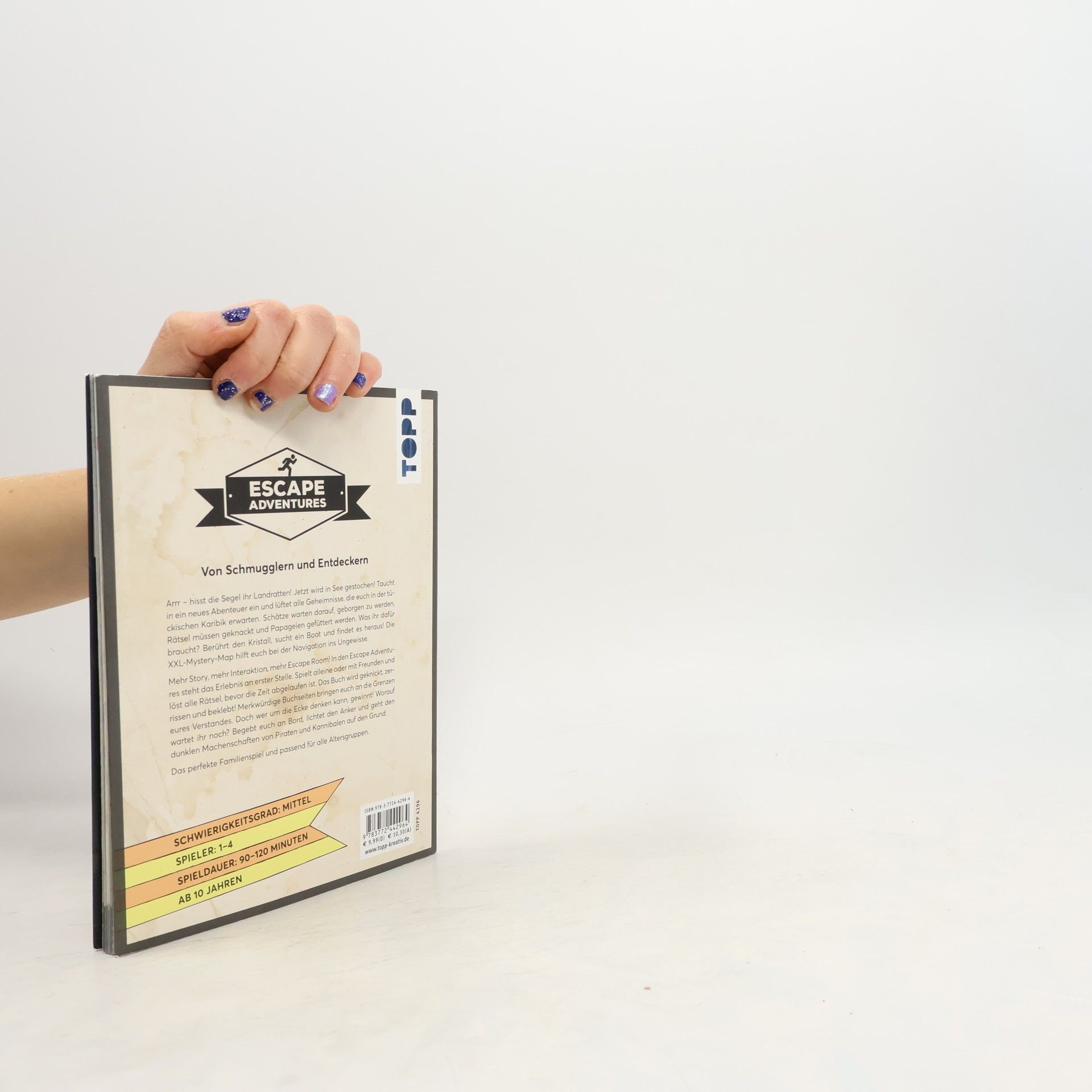 Der Escape Room für Zuhause! Jetzt wird in See gestochen! Findet ein Boot, hisst die Segel und erkundet die Karibik. Aber nehmt euch vor den Piraten in acht, haltet im Dschungel nach den Kannibalen Ausschau und bergt alle Schätze, bevor die Zeit abgelaufen ist. Vor euch liegen üble Gefahren, tückische Rätsel und zahlreiche Geheimnisse. Worauf wartet ihr noch? Lichtet den Anker und lüftet das Mysterium! Mehr Story, mehr Interaktion, mehr Escape Room! In den Escape Adventures steht das Erlebnis an erster Stelle. Spielt alleine oder mit Freunden und löst alle Rätsel, bevor die Zeit abgelaufen ist. Schafft ihr es in 60 Minuten, 90 Minuten oder 120 Minuten? Seht genau hin und seid nicht zu hastig, dann wird das Spiel das Highlight eures nächsten Spieleabends! Und alle, die den Exit nicht selbständig finden können, müssen nicht verzagen, denn Hinweise und Lösungen bringen euch auch in kniffligen Situationen Schritt für Schritt voran. Ihr werdet auf merkwürdige Buchseiten stoßen, das Buch zerschneiden und bekleben und euer Boot auf der XXL-Mystery-Map durch die wilde See navigieren. Setzt eure Augenklappe auf und holt euren Hut, das Abenteuer beginnt! Das perfekte Familienspiel und passend für alle Altersgruppen. Schwierigkeitsgrad: Mittel Spieler: 1–4 Spieldauer: 90–120 Minuten Ab 10 Jahren