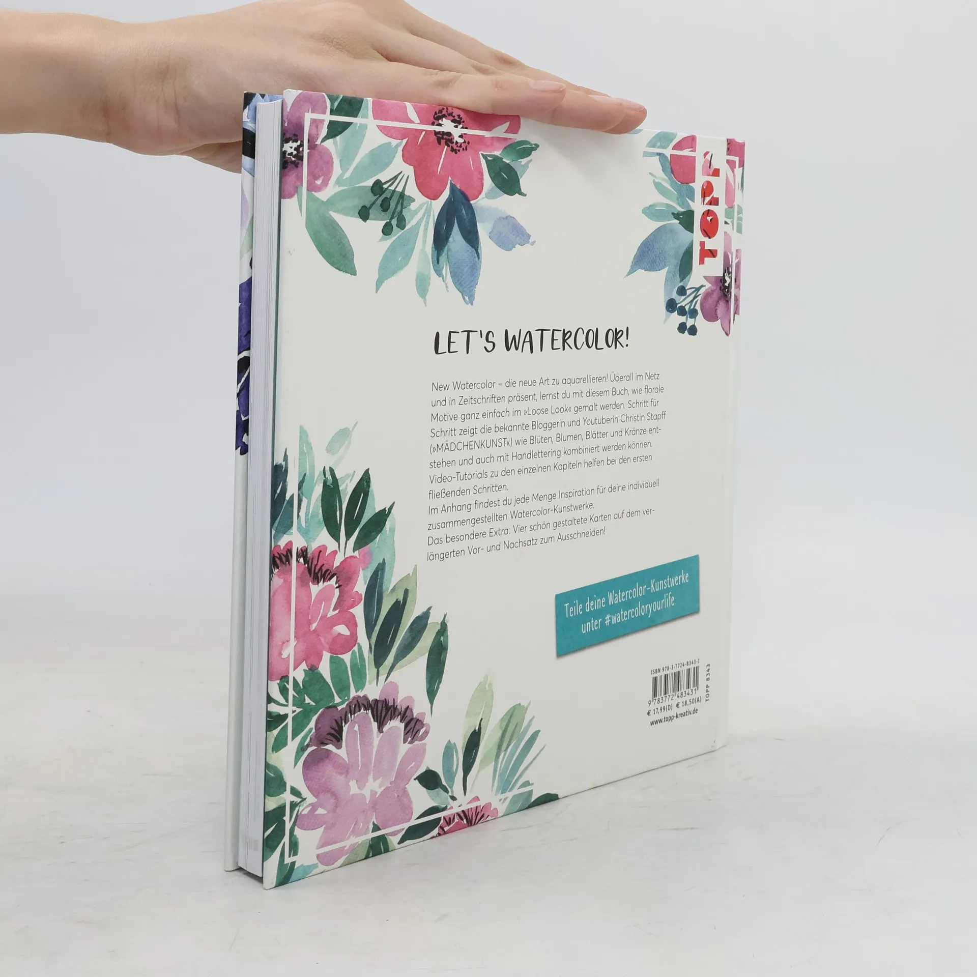 New Watercolor - die neue Art zu aquarellieren! Überall im Netz und in Zeitschriften präsent, lernst du mit diesem Buch, wie florale Motive ganz einfach gemalt werden. Schritt für Schritt zeigt dir die bekannte Bloggerin und Youtuberin Christin Stapff von Mädchenkunst wie Blüten, Blumen, Blätter und Kränze entstehen und auch mit Handlettering kombiniert werden können. Video-Tutorials helfen bei den ersten fließenden Schritten. So entstehen Rosen, Chrysanthemen, Kräuter und unterschiedliche Blätter, die auch individuell zusammengestellt werden können. Watercolor ist gar nicht so schwer, lässt sich auf Karten hervorragend einsetzen und macht wahnsinnig Spaß! Das besondere Extra: Vier schön gestaltete Karten auf dem verlängerten Vorsatz zum Ausschneiden!