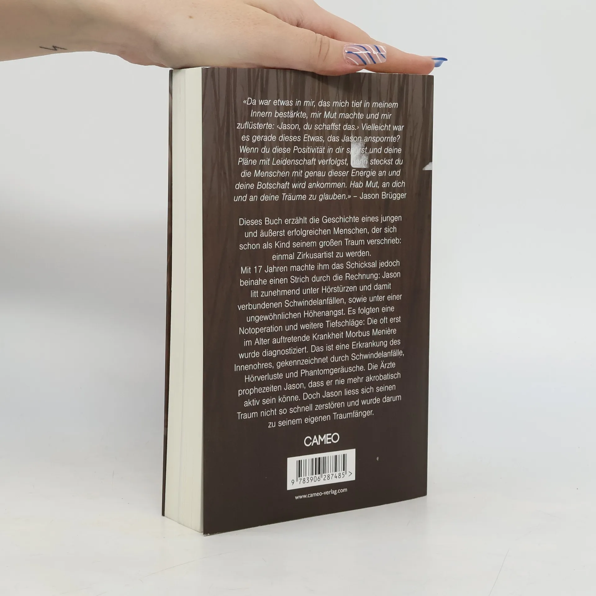 «Da war etwas in mir, das mich tief in meinem Innern bestärkte, mir Mut machte und mir zuflüsterte: ‹Jason, du schaffst das.› Vielleicht war es gerade dieses etwas, das Jason anspornte? Wenn du diese Positivität in dir spürst und deine Pläne mit Leidenschaft verfolgst, dann steckst du die Menschen mit genau dieser Energie an und deine Botschaft wird ankommen. Hab Mut, an dich und an deine Träume zu glauben.» – Jason Brügger Dieses Buch erzählt die Geschichte eines jungen und äußerst erfolgreichen Menschen, der sich schon als Kind seinem großen Traum verschrieb: einmal Zirkusartist zu werden. Mit 17 Jahren machte ihm das Schicksal jedoch beinahe einen Strich durch die Rechnung: Jason litt zunehmend unter Hörstürzen und damit verbundenen Schwindelanfällen, sowie unter einer ungewöhnlichen Höhenangst. Es folgten eine Notoperation und weitere Tiefschläge: Die oft erst im Alter auftretende Krankheit Morbus Menière wurde diagnostiziert. Das ist eine Erkrankung des Innenohres, gekennzeichnet durch Schwindelanfälle, Hörverluste und Phantomgeräusche. Die Ärzte prophezeiten Jason, dass er nie mehr akrobatisch aktiv sein könne. Doch Jason liess sich seinen Traum nicht so schnell zerstören und wurde darum zu seinem eigenen Traumfänger.