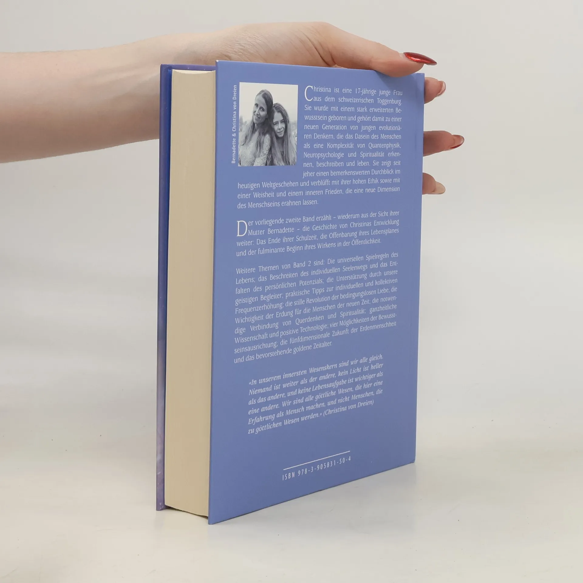 Christina, eine 17-jährige aus dem Toggenburg, gehört zu einer neuen Generation evolutionärer Denker, die das menschliche Dasein als eine Verbindung von Quantenphysik, Neuropsychologie und Spiritualität begreifen. Sie zeigt außergewöhnlichen Durchblick in aktuellen Weltgeschehen und beeindruckt mit hoher Ethik sowie einer Weisheit und innerem Frieden, die eine neue Dimension des Menschseins erahnen lassen. Ihre Überzeugung, dass wir im Kern alle gleich sind und göttliche Wesen sind, die menschliche Erfahrungen machen, prägt ihre Sichtweise. Der zweite Band, erzählt aus der Perspektive ihrer Mutter Bernadette, setzt Christinas Entwicklung fort: von ihrem Schulabschluss über die Enthüllung ihres Lebensplans bis hin zu ihrem öffentlichen Wirken. Themen sind die universellen Spielregeln des Lebens, der individuelle Seelenweg, die Entfaltung des persönlichen Potenzials und die Unterstützung durch geistige Begleiter. Praktische Tipps zur Frequenzsteigerung, die stille Revolution der bedingungslosen Liebe, Erdung für die neue Zeit, die Verbindung von Querdenken und Spiritualität sowie ganzheitliche Wissenschaft und positive Technologie werden behandelt. Zudem werden Möglichkeiten der Bewusstseinsausrichtung und die Vision einer fünfdimensionalen Zukunft der Menschheit thematisiert.
