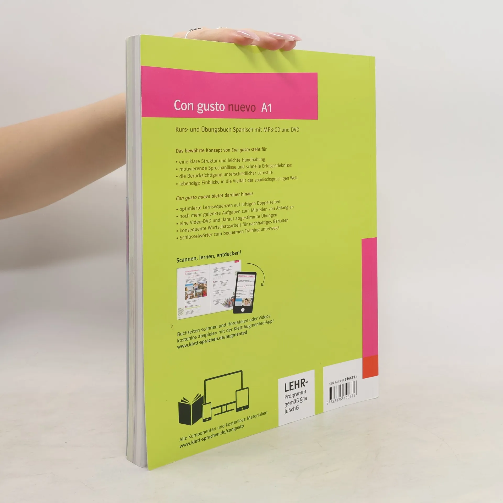 Con gusto nuevo - die Nummer 1 mit verbesserter Rezeptur! Die Neubearbeitung Con gusto nuevo bewahrt die Qualitäten seines Vorgängers: vom transparenten Lektionsaufbau über die motivierenden Sprechanlässe bis zum Eintauchen in die spanischsprachige Welt – das alles in Verbindung mit einer behutsamen Reduzierung der Stoffmenge und noch mehr praktischem Training. Freuen Sie sich auf: - Optimierte Lernsequenzen auf luftigeren Doppelseiten - Verstärkte Wortschatzarbeit - Charmante Videosequenzen mit Untertitel-Option (online) - Transparenter Lektionsaufbau - Motivierende Sprechanlässe von Anfang an - Eintauchen in die spanischsprachige Welt