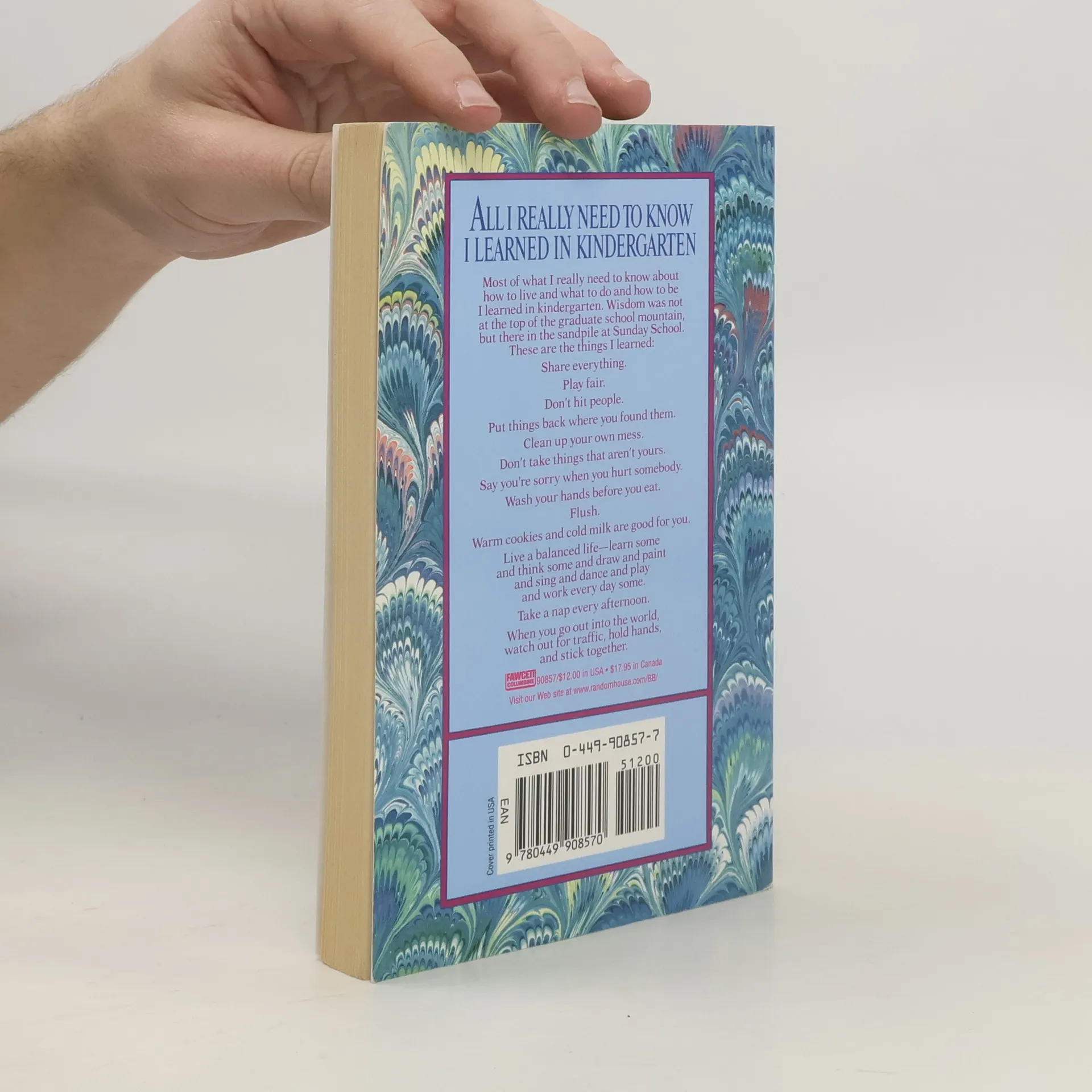 Most of what I really need to know about how to live and what to do and how to be I learned in kindergarten. Wisdom was not at the top of the graduate school mountain, but there in the sandpile at Sunday School. These are the things I learned: Share everything. Play fair. Don't hit people. Put things back where you found them. Clean up your own mess. Don't take things that aren't yours. Say you're sorry when you hurt somebody. Wash your hands before you eat. Flush. Warm cookies and cold milk are good for you. Live a balanced life. Take a nap every afternoon. When you go out into the world, watch out for traffic, hold hands, and stick together.