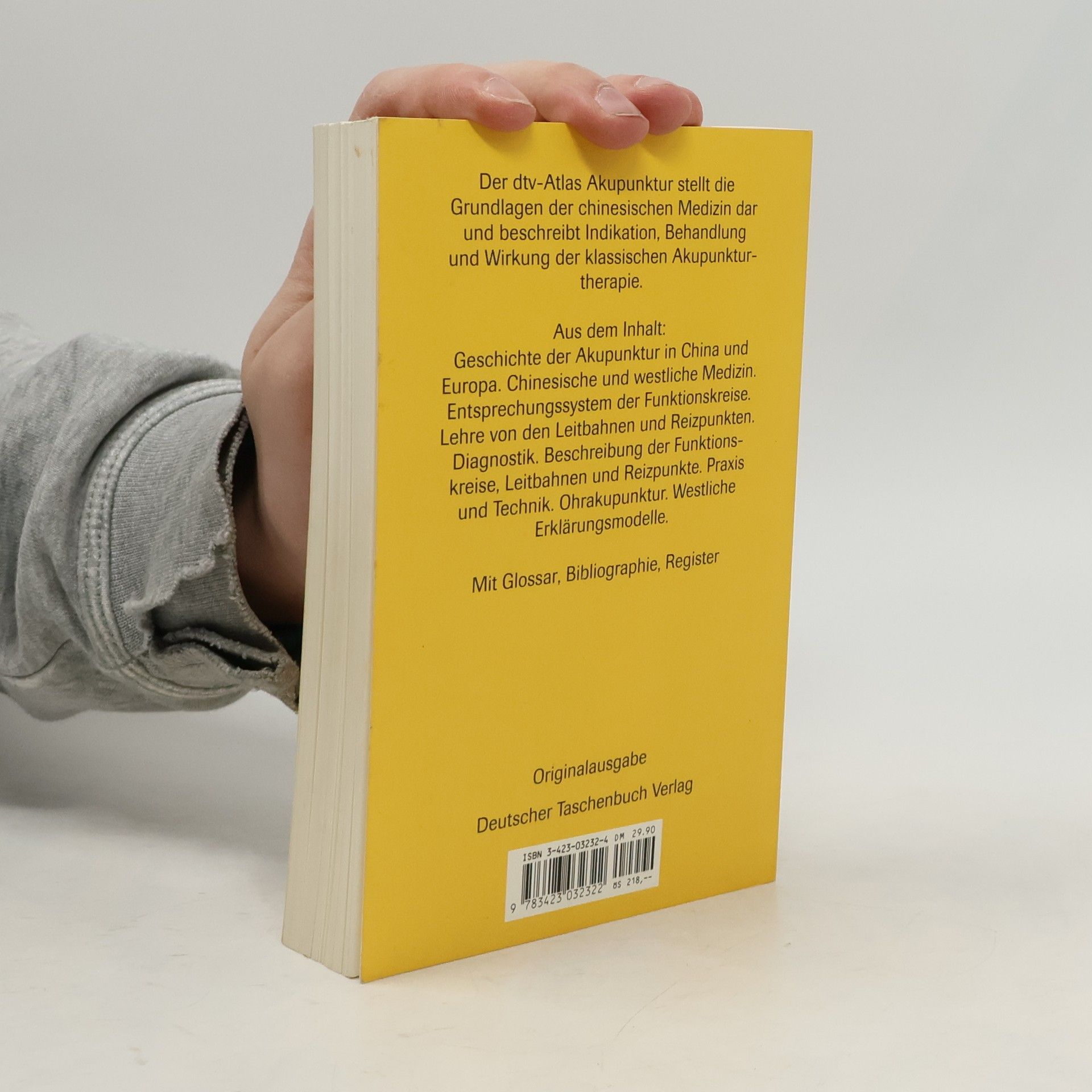 Mit 135 farbigen Abbildungsseiten Graphikerin: Ulrike Brugger Der dtv-Atlas Akupunktur gibt einen Überblick über die Geschichte der Akupunktur in China und in Europa. Er stellt die Grundlagen der chinesischen Medizin dar und beschreibt Indikation, Behandlung und Wirkung der klassischen Akupunkturtherapie. Der dtv-Atlas Akupunktur ist ein Standardwerk zu diesem Thema geworden und liegt inzwischen in einer Auflage von 150.000 Exemplaren vor. Das Buch bietet interessierten Laien einen anschaulichen Einblick und gibt Ärzten, Studierenden und den medzinisch Tätigen ein übersichtliches und exaktes Nachschlagewerk an die Hand. Aus dem Inhalt: Geschichte der Akupunktur. Chinesische und westliche Medizin. Entsprechungssystem der Funktionskreise. Lehre von den Leitbahnen und Reizpunkten. Diagnostik. Beschreibung der Funktionskreise. Leitbahnen und Reizpunkte. Praxis und Technik. Ohrakupunktur. Westliche Erklärungsmodelle. Mit Glossar, Bibliographie und Register Der dtv-Atlas Akupunktur wurde 1995 mit dem Prädikat »eines der schönsten deutschen Bücher« der Stiftung Buchkunst ausgezeichnet.