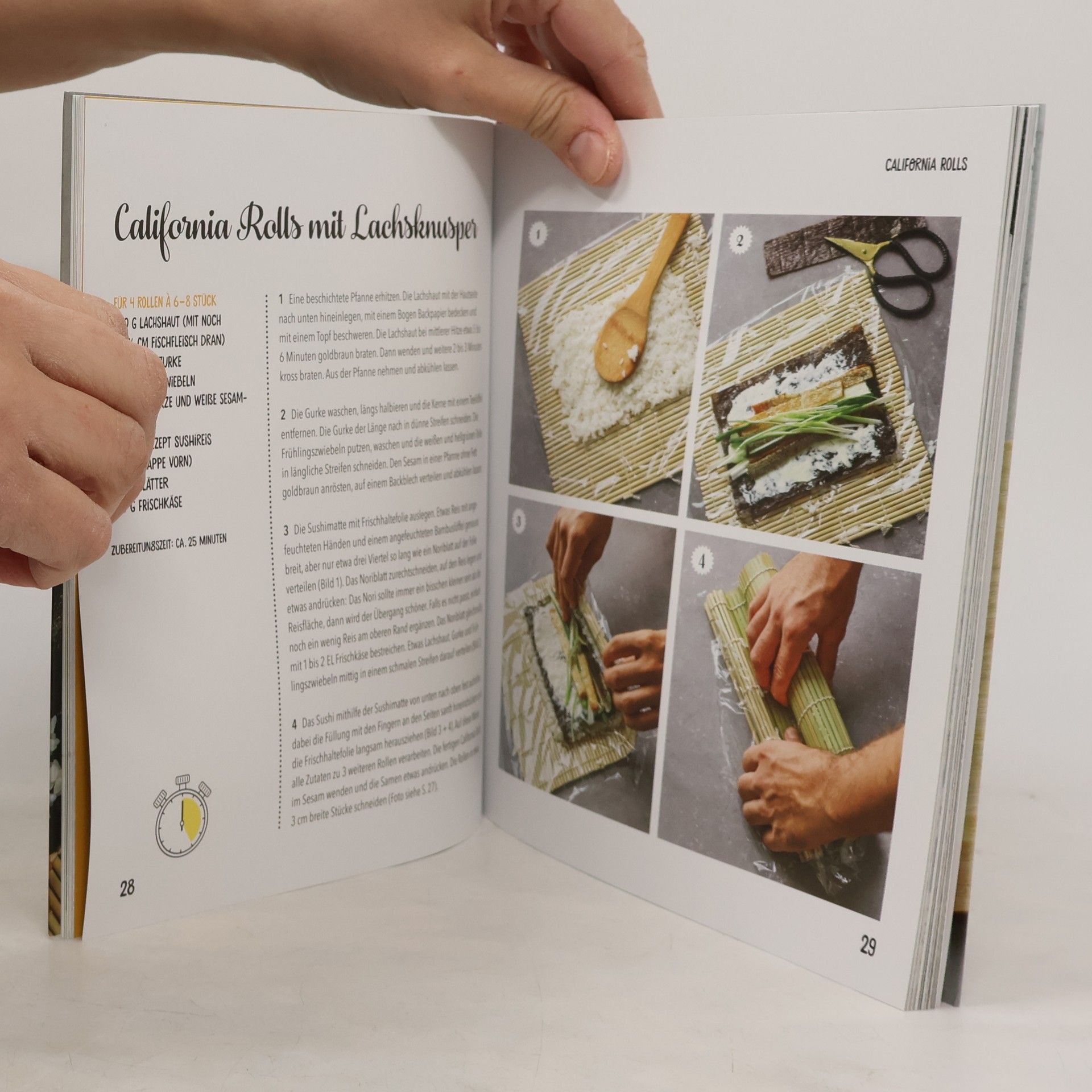 Das Sushizubereiten ist in Japan ein richtiges Handwerk. Also viel zu kompliziert zum Selbstmachen? Nicht, wenn man den richtigen Dreh raushat. Denn dann öffnet sich einem die variantenreiche Welt der japanischen Leckerbissen. „Sushi – Fix gerollt für alle“ bietet den richtigen Start in die Welt der exotischen Häppchen: In Step-by-step-Bildern wird gezeigt, wie die Zubereitung von Maki & co. ganz fix und easy gelingt. Rund 30 raffinierte, schnell gemachte Rezepte präsentieren dann die ganze Vielfalt des Sushi-Genusses: Von Klassikern wie Maki und California Rolls bis zu trendigen Onigiri, Sushi Bowls, Sandwiches und sogar Sushirollen ohne Reis, dafür mit Quinoa & Co. Da kommt ganz schnell Japan-Feeling auf. Und das Beste? Sushi sind für überall die praktische Mahlzeit: gesund, handlich, lecker und dazu noch ein richtiger Eyecatcher auf dem Teller. Da kann man nur noch sagen: Auf die Plätze, fertig, losgerollt!