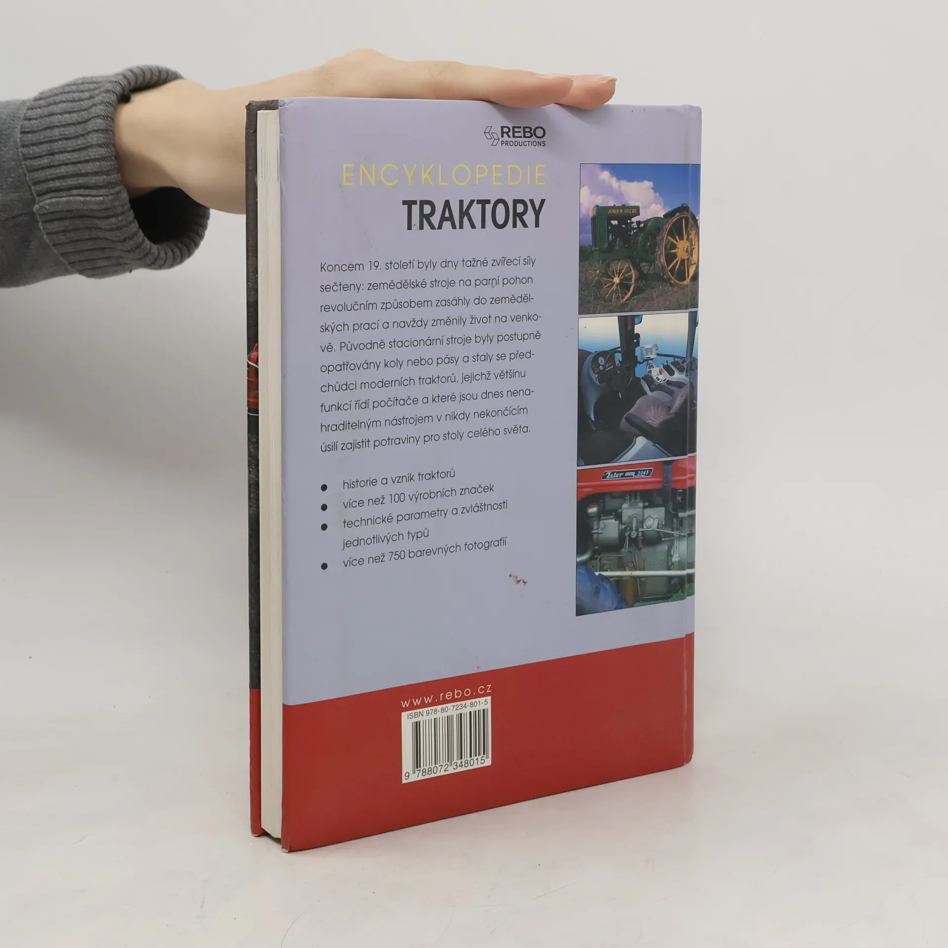 Encyklopedie popisuje historii a vznik traktorů, uvádí více než 100 výrobních značek, technické parametry a zvláštnosti jednotlivých typů a více než 750 barevných fotografií.