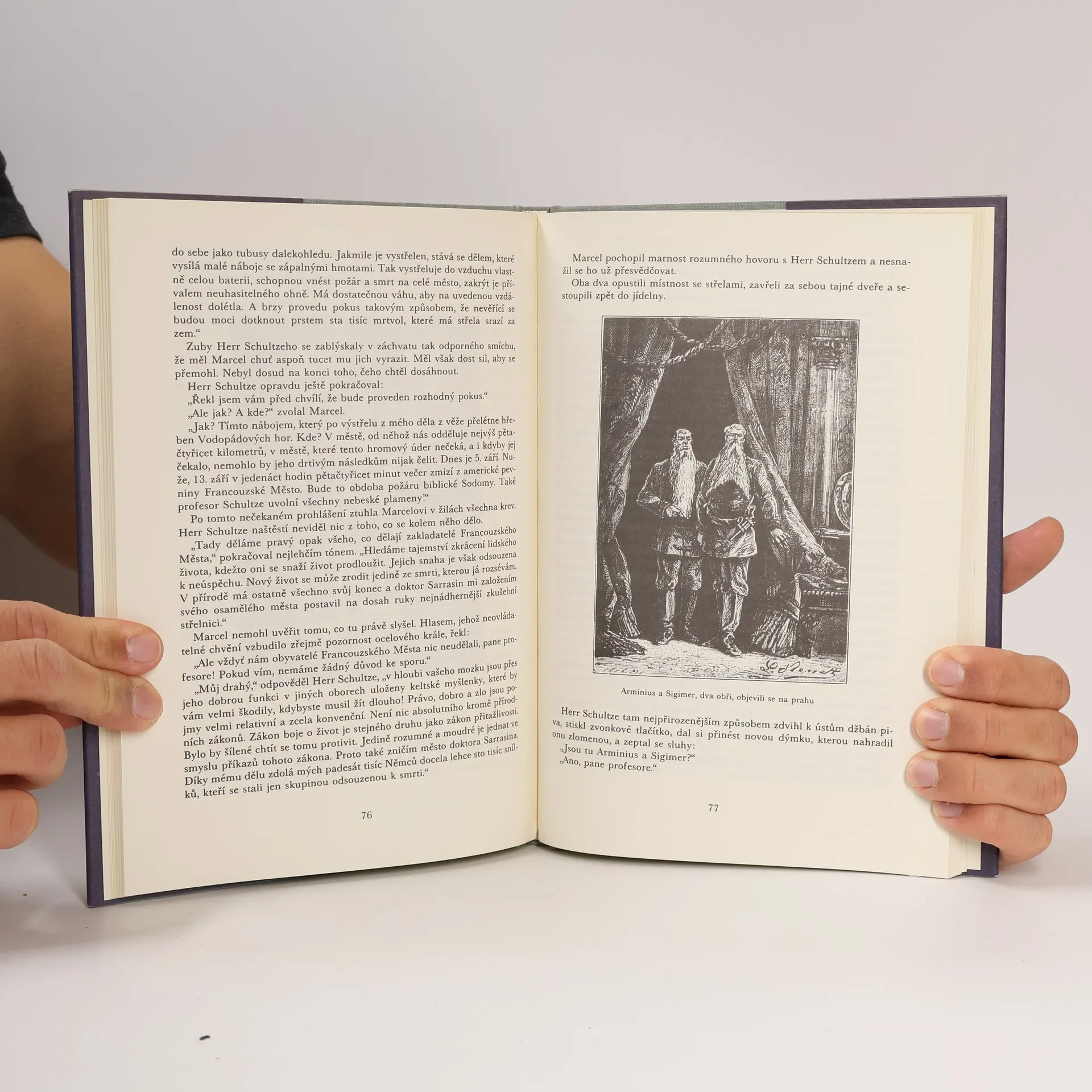 Sci-fi román o soupeření francouzského a německého vědce. Prvý vybuduje v Americe Francouzské město jako vzor všestranného pokroku, Němec postaví Ocelové město, ohromnou továrnu, v níž hromadí vynálezy zkázy, a chystá se zničit dílo francouzského soupeře. Místo toho zničí sebe. Nechtěným úspěchem Němce je vystřelení dělového náboje, který překoná zemskou přitažlivost a změní se v družici Zem. Kapitoly: 1. Na scénu vstupuje pan Sharp, 2. Dva přátelé, 3. Rúzné zprávy, 4. Rozdělení dědictví, 5.Ocelové Město, 6. Dúl Albrecht, 7. Ústřední blok, 8.Dračí jeskyně, 9. P.P.C., 10. Článek v německé revui Naše století, 11. Večeře u doktora Sarrasina, 12. Porada, 13. Marcel Bruckmann profesoru Schultzemu, 14. Příprava k boji, 15. Burza v San Francisku, 16. Dva Francouzi proti celému městu, 17. Místo vysvětlení rány z pušek, 18. Jádro věci, 19. Rodinná záležitost, 20. Závěr. Cena v čase vydání knihy: 24 Kčs. -- zdroj: legie.info --