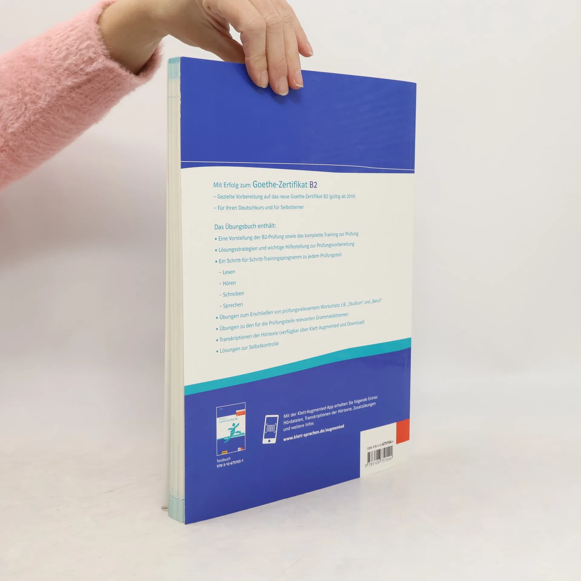 Mit Erfolg zum Goethe-Zertifikat B2 Gezielte Vorbereitung auf das neue Goethe-Zertifikat B2 (gültig ab 2019) Für Ihren Deutschkurs und für Selbstlerner Das Übungsbuch enthält: Eine Vorstellung der B2-Prüfung sowie das komplette Training zur Prüfung Lösungsstrategien und wichtige Hilfestellung zur Prüfungsvorbereitung Ein Schritt-für Schritt-Trainingsprogramm zu jedem Prüfungsteil Lesen Hören Schreiben Sprechen Übungen zum Erschließen von prüfungsrelevantem Wortschatz z. B. „Studium“ und „Beruf“ Übungen zu den für die Prüfungsteile relevanten Grammatikthemen Transkriptionen der Hörtexte (verfügbar über Klett Augmented und Download) Lösungen zur Selbstkontrolle