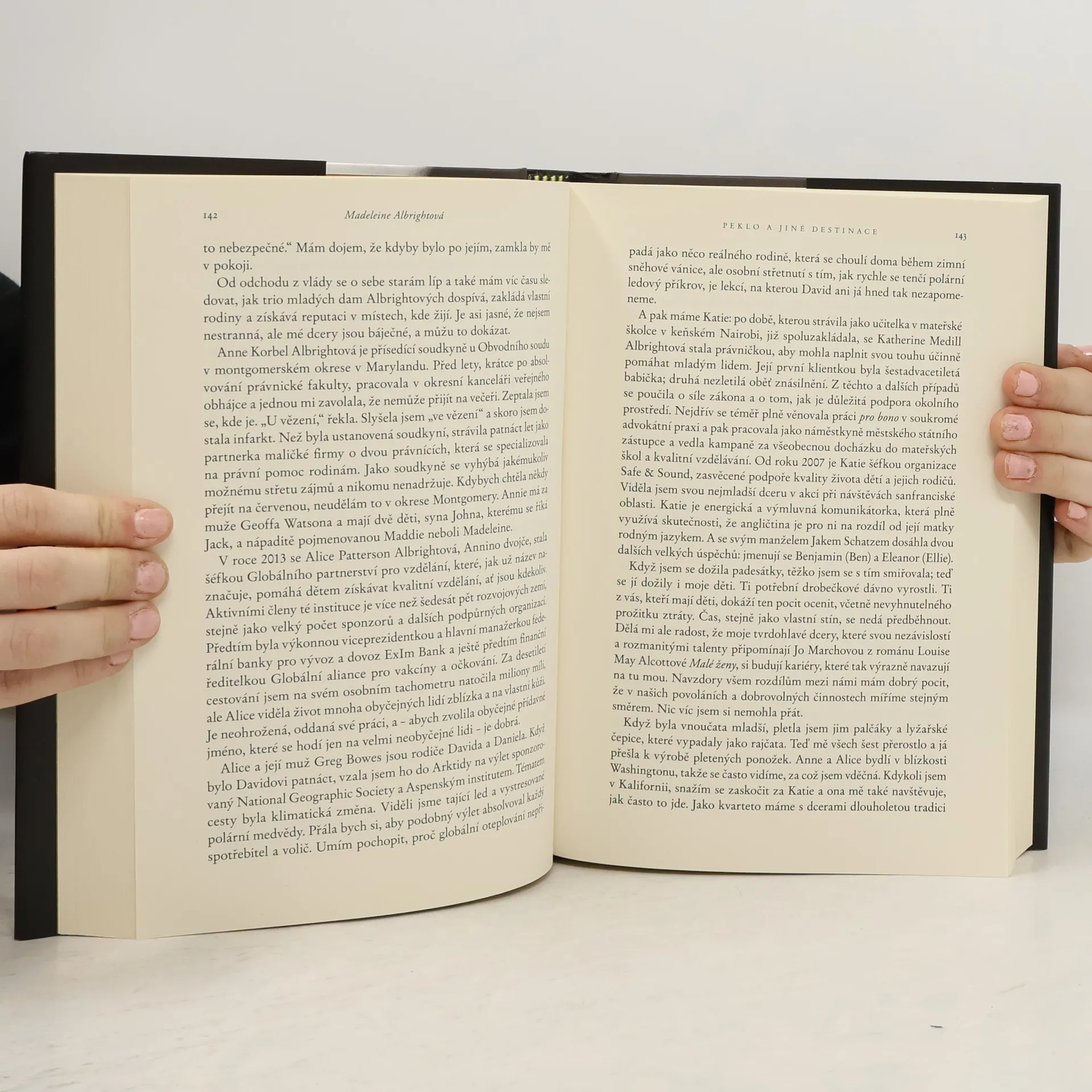 V roce 2001, po ukončení své funkce ministryně zahraničí, se Madeleine Albrightová vrhla do nové kariéry, která by vydala na několik životů. Začala psát knihy, učit na univerzitě, zakládala konzultační firmu a investiční fond, a zároveň se angažovala v prosazování demokratických hodnot. V debatách se střetávala s významnými politiky a ve svých knihách varovala před návratem fašismu, podporovala práva žen a pomáhala těm, kteří nemají možnost být slyšet. Jako matka tří dcer začala pracovat na plný úvazek až v devětatřiceti letech, přičemž zdůrazňuje, že jakmile našla svůj hlas, byla odhodlaná ho nechat zaznít. Její nová kniha, nazvaná Peklo a jiné destinace, nabízí zábavnou a osobní rekapitulaci jejího „života po politické smrti“. Albrightová se dělí o důvěrné historky a otevřeně hovoří o nedostatku odvážných lídrů, nutnosti potírat lži a závazku starších generací vůči mladším. Považuje se za „optimistu s obavami“ a nabádá čtenáře, aby si navzájem důvěřovali. Kniha je nejen kronikou naší doby, ale také fascinujícím autoportrétem ženy, která se proslavila nejen politickými úspěchy, ale také osobními zážitky, jako je hraní na bubny před davem nebo tanec s Robertem Redfordem. Albrightová se zde představuje s vtipem, šarmem a upřímností.
