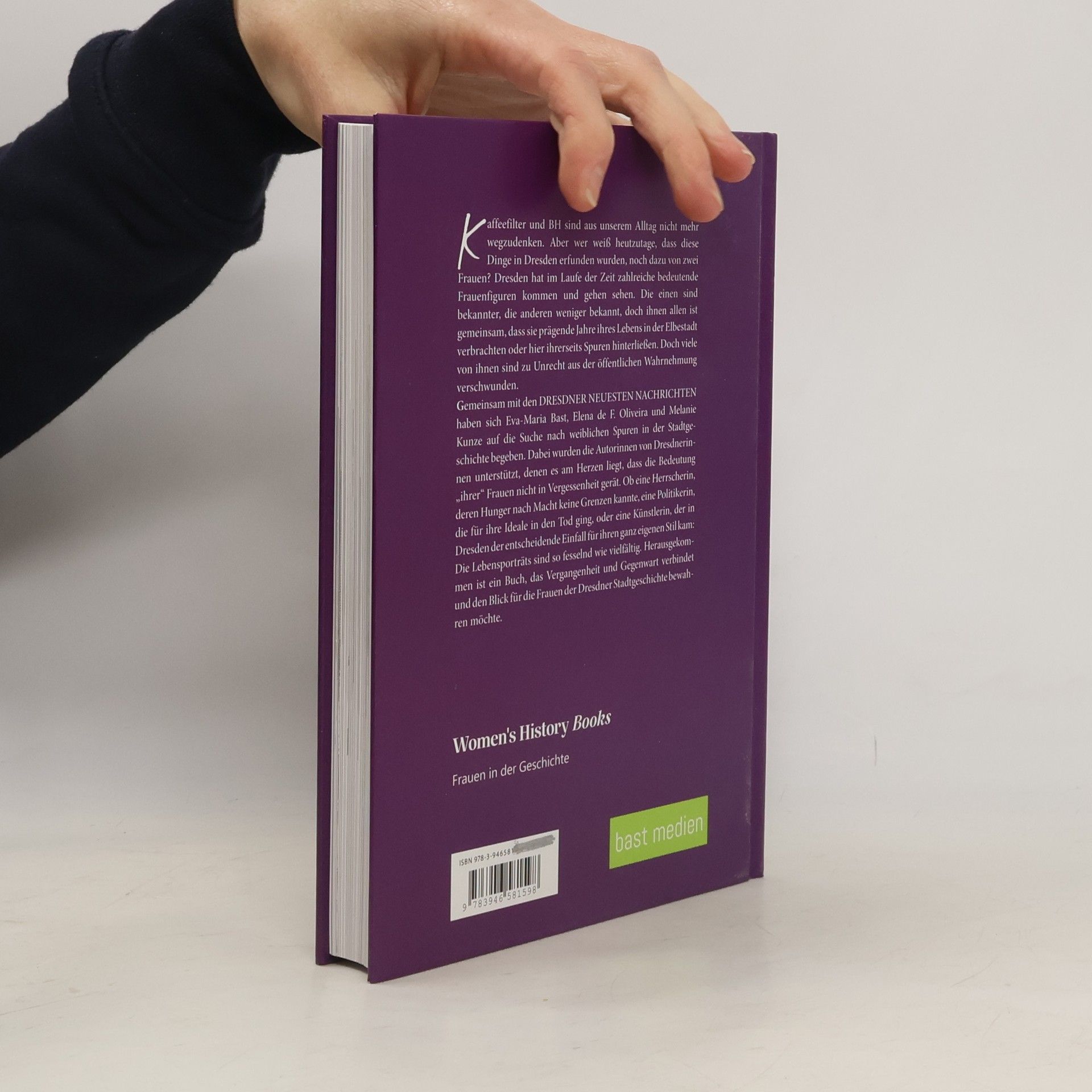 Kaffeefilter und BH sind aus unserem Alltag nicht mehr wegzudenken. Aber wer weiß heutzutage, dass diese Dinge in Dresden erfunden wurden, noch dazu von zwei Frauen? Dresden hat im Laufe der Zeit zahlreiche bedeutende Frauenfiguren kommen und gehen sehen. Die einen sind bekannter, die anderen weniger bekannt, doch ihnen allen ist gemeinsam, dass sie prägende Jahre ihres Lebens in der Elbestadt verbrachten oder hier ihrerseits Spuren hinterließen. Doch viele von ihnen sind zu Unrecht aus der öffentlichen Wahrnehmung verschwunden. Gemeinsam mit den DRESDNER NEUESTEN NACHRICHTEN haben sich Eva-Maria Bast, Elena de F. Oliveira und Melanie Kunze auf die Suche nach weiblichen Spuren in der Stadtgeschichte begeben. Dabei wurden die Autorinnen von Dresdnerinnen unterstützt, denen es am Herzen liegt, dass die Bedeutung „ihrer“ Frauen nicht in Vergessenheit gerät. Ob eine Herrscherin, deren Hunger nach Macht keine Grenzen kannte, eine Politikerin, die für ihre Ideale in den Tod ging, oder eine Künstlerin, der in Dresden der entscheidende Einfall für ihren ganz eigenen Stil kam: Die Lebensporträts sind so fesselnd wie vielfältig. Herausgekommen ist ein Buch, das Vergangenheit und Gegenwart verbindet und den Blick für die Frauen der Dresdner Stadtgeschichte bewahren möchte.