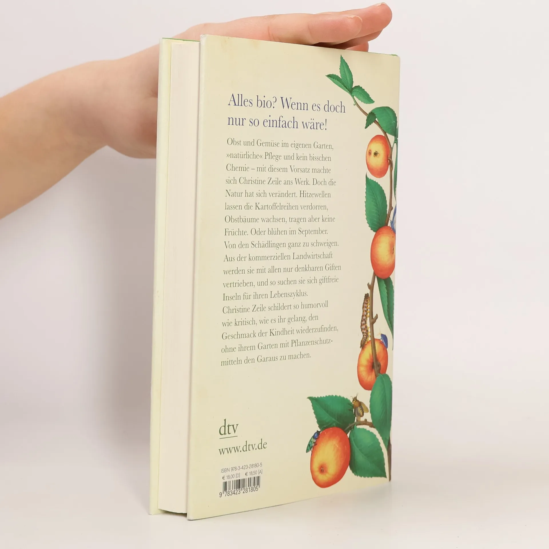 Alles Bio? Die Autorin begibt sich mit dem Ziel, Obst und Gemüse im eigenen Garten ohne Chemie anzubauen, jedoch stellt sie schnell fest, dass die Natur sich verändert hat. Hitzewellen lassen Kartoffeln verdorren, Obstbäume tragen keine Früchte oder blühen im September, und Schädlinge finden in der kommerziellen Landwirtschaft giftfreie Rückzugsorte. Entschlossen geht die Gärtnerin den Kampf gegen die Schädlinge an, indem sie zunächst die Raupen von den Bäumen pflückt. Doch das reicht nicht aus. Sie taucht in die Welt der Pflanzenschutzmittel ein, wo Neonicotinoide das Insektenleben bedrohen und Glyphosat den Boden belastet. Dabei wird ihr das Ausmaß der Insektengiftbelastung in der Landschaft bewusst, die nötig ist, um Obst zu Niedrigpreisen in Supermärkten anzubieten. Mit innovativen biologischen Maßnahmen, einschließlich eines Granulosevirus, gelingt es Christine Zeile schließlich, den Geschmack ihrer Kindheit im eigenen Garten zurückzugewinnen, ohne auf chemische Pflanzenschutzmittel zurückzugreifen. Ihre Erlebnisse schildert sie humorvoll und kritisch, und das Buch ist durchgehend in vier Farben liebevoll illustriert.