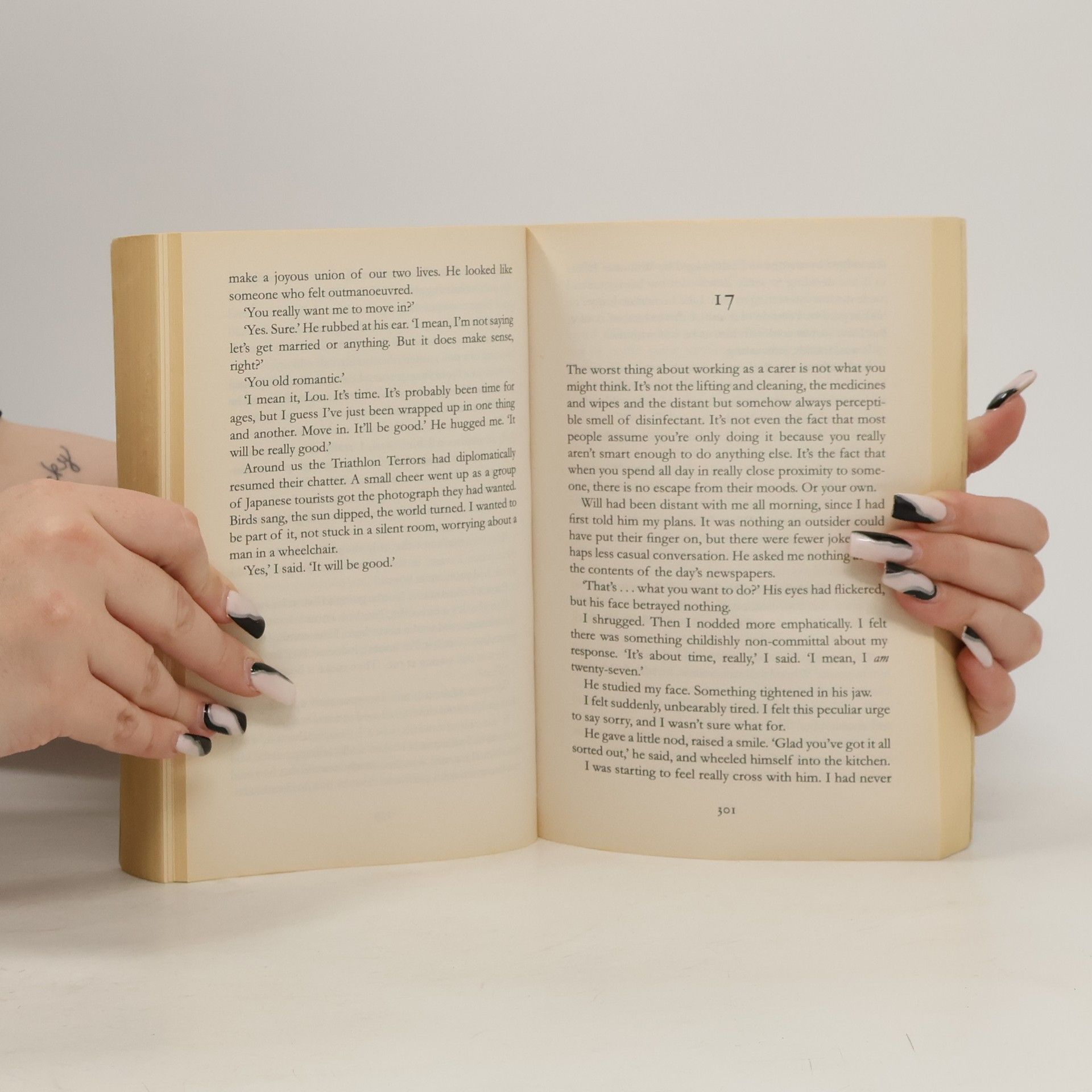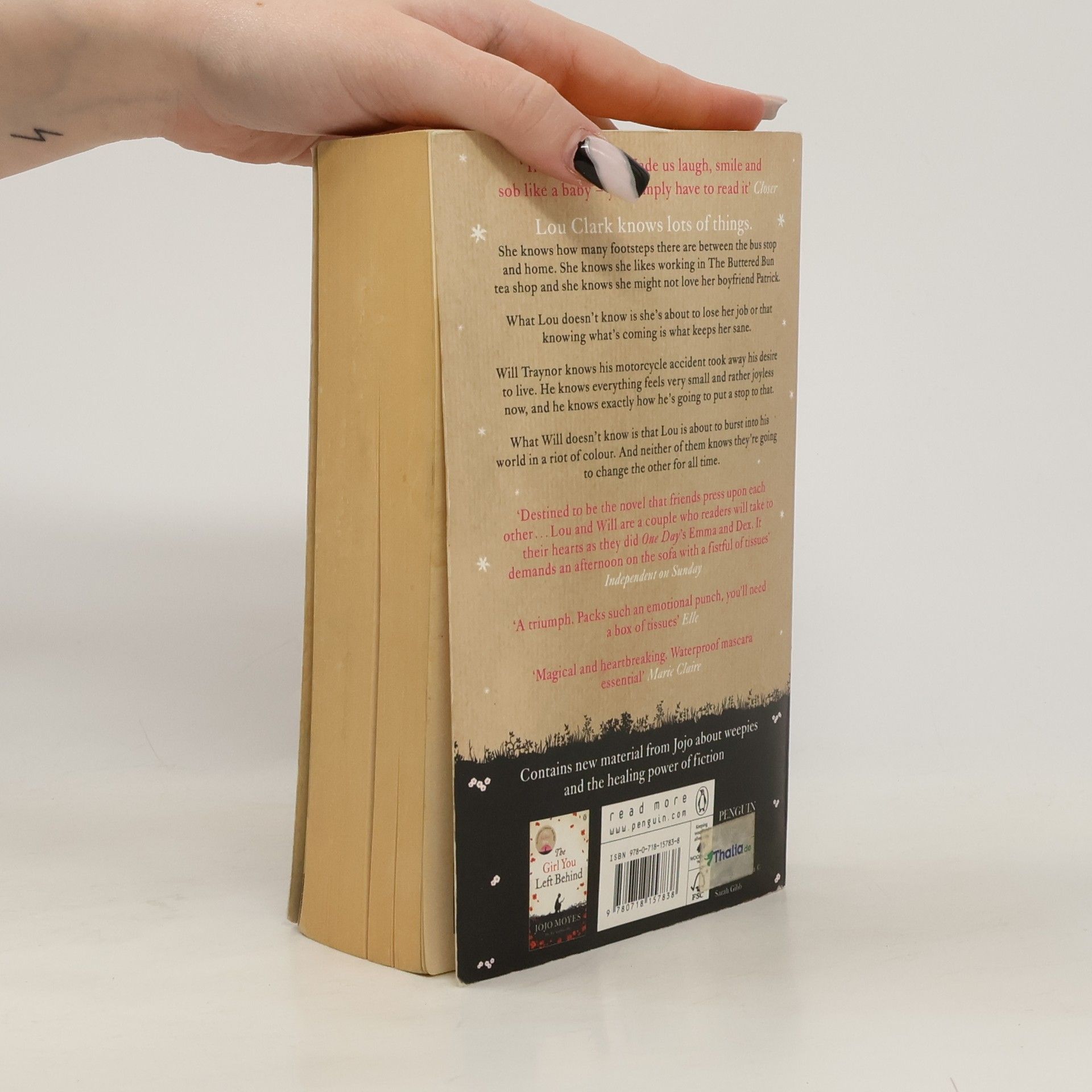Lou Clark knows lots of things. She knows how many footsteps there are between the bus stop and home. She knows she likes working in The Buttered Bun tea shop and she knows she might not love her boyfriend Patrick. What Lou doesn't know is she's about to lose her job or that knowing what's coming is what keeps her sane. Will Traynor knows his motorcycle accident took away his desire to live. He knows everything feels very small and rather joyless now and he knows exactly how he's going to put a stop to that. What Will doesn't know is that Lou is about to burst into his world in a riot of colour. And neither of them knows they're going to change the other for all time.