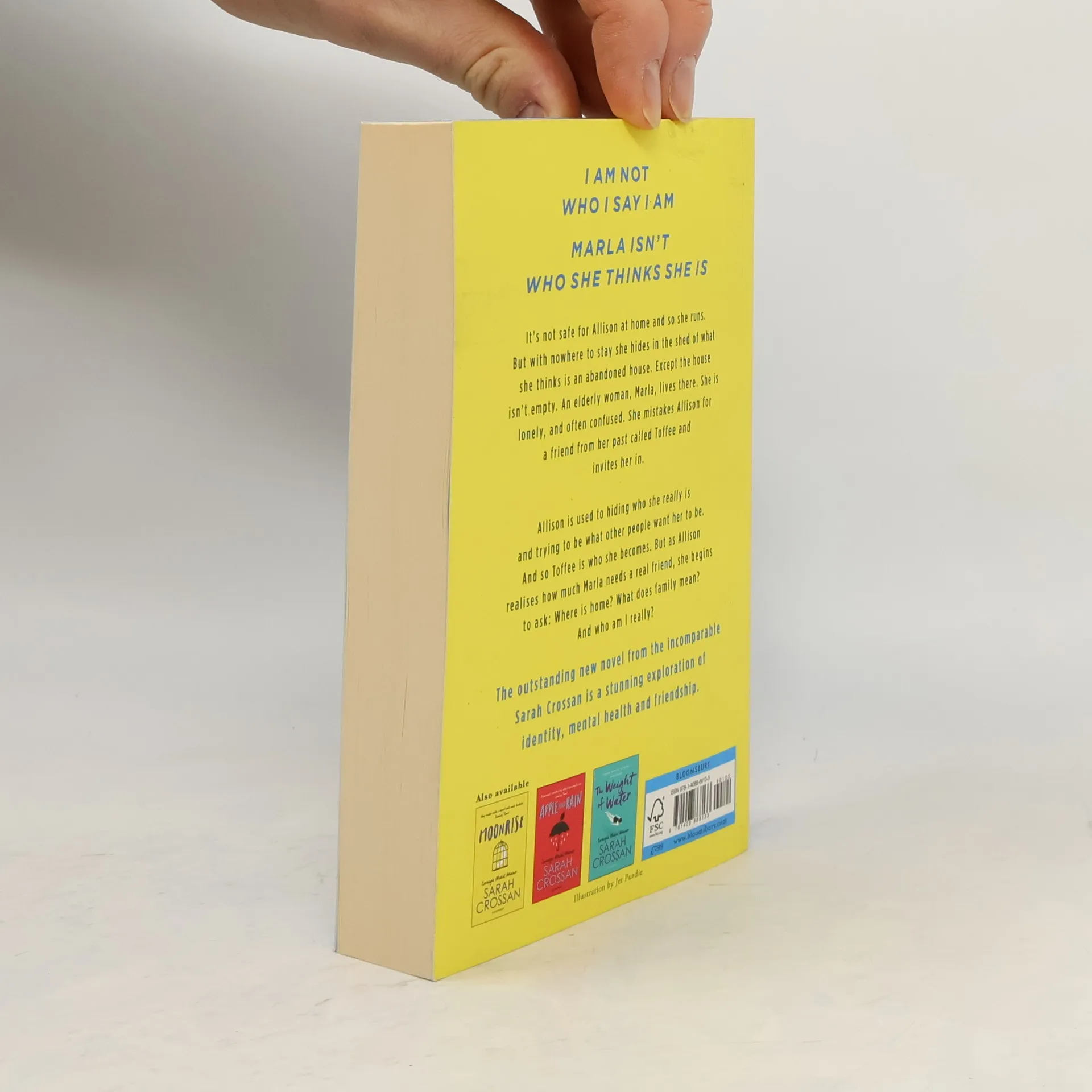 _______________'Utterly sublime' - Cecelia Ahern'Impossible not to read it in a single gulp' - The Times'Undoubtedly one of the best books of the year' - Irish Times_______________SHORTLISTED FOR THE INDIE BOOK AWARDSWINNER OF THE BOOKS ARE MY BAG YA AWARD_______________I am not who I say I am.Marla isn't who she thinks she is.I am a girl trying to forget.Marla is a woman trying to remember.When Allison runs away from home, she doesn't expect to be taken in by Marla, an elderly woman with dementia, who mistakes her for an old friend called Toffee. Allison is used to hiding who she really is and trying to be what other people want her to be. And so Toffee is who she becomes. But as her bond with Marla grows, Allison begins to ask herself: Where is home? What is a family? And, most importantly, Who am I, really?_______________'Compelling and beautifully wrought' - The Sunday Times'A book that changes its reader for the better' - Guardian'One of our most original writers' - John Boyne_______________Experience every emotion with the finest verse novelist of our generation...Don't miss Sarah Crossan's other irresistibly page-turning books Moonrise, One, Apple and Rain, and The Weight of Water.