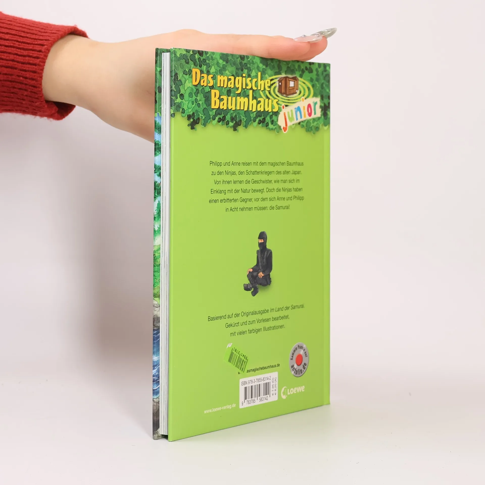Das Buch ist bei deiner Buchhandlung vor Ort und bei vielen Online-Buchshops erhältlich!+ Bücher, die Kinder gerne lesen wollen + Beliebte Themen: Abenteuer, Tiere, fremde Länder und Ninjas + Hochwertiges Hardcover + Mit vielen Illustrationen + Bereits über 10 Millionen verkaufte Bücher der Baumhaus-Reihe + Ausgewogenes Text-Bild-Verhältnis + Große Schrift + Kurze Kapitel + Philipp und Anne reisen mit dem magischen Baumhaus zu den Ninjas, den Schattenkriegern des alten Japan. Von ihnen lernen die Geschwister, wie man sich im Einklang mit der Natur bewegt. Doch die Ninjas haben einen erbitterten Gegner, vor dem sich Anne und Philipp in Acht nehmen müssen: die Samurai! Basierend auf der Originalausgabe „Im Land der Samurai“. Gekürzt und zum Vorlesen bearbeitet, mit vielen farbigen Illustrationen. Die beliebte Kinderbuch-Reihe von Bestsellerautorin Mary Pope Osborne zum Vor- und Selberlesen. Die Geschwister Anne und Philipp reisen mit dem magischen Baumhaus durch die Zeit, entdecken ferne Länder und erleben spannende Abenteuer. Mit vielen bunten Bildern, besonders für Kinder ab 6 Jahren geeignet. Mehr Infos zur Reihe und tolle Extras unter: www. MagischesBaumhaus. de