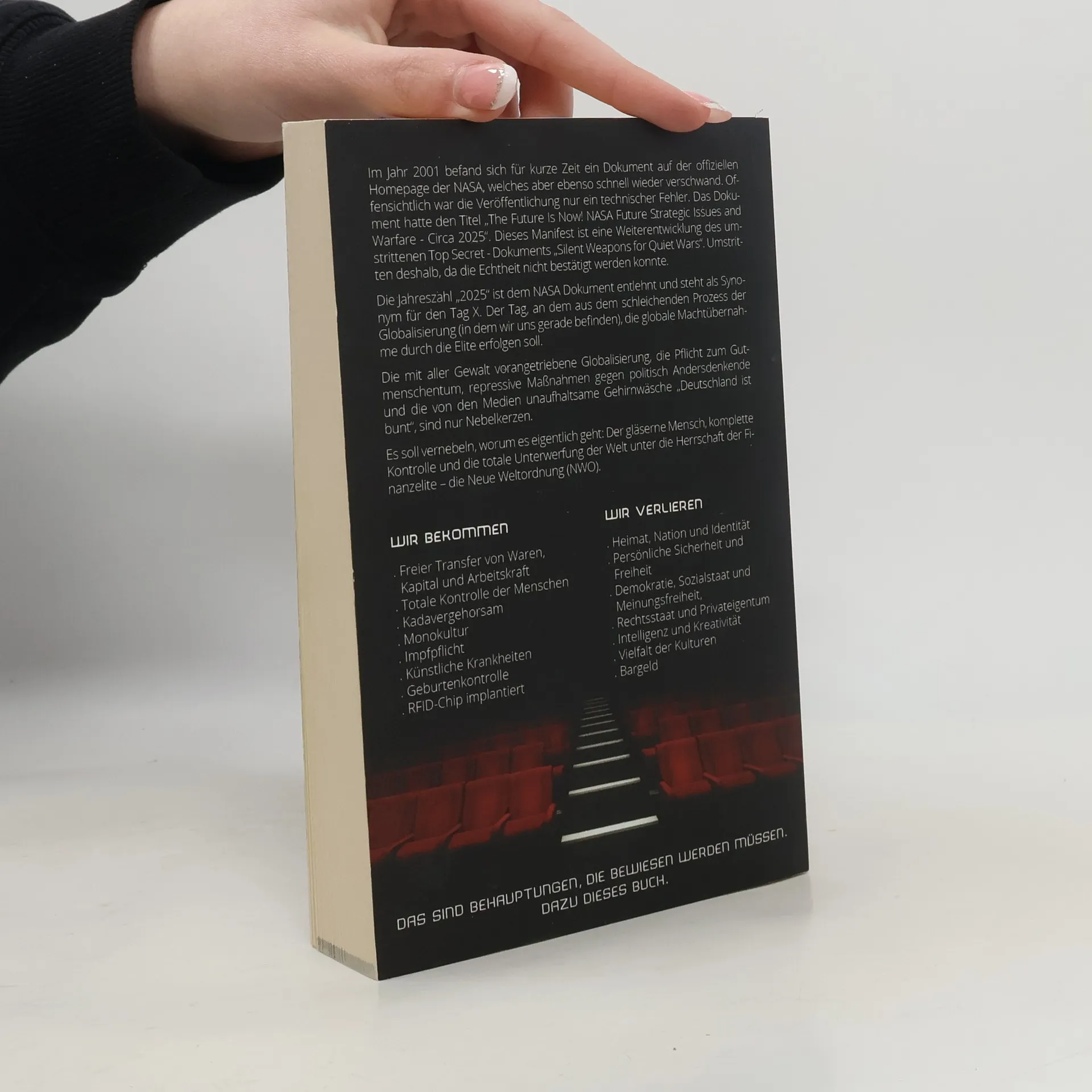Im Jahr 2001 erschien kurzzeitig ein Dokument auf der NASA-Website, das schnell wieder entfernt wurde. Der Titel „The Future Is Now! NASA Future Strategic Issues and Warfare - Circa 2025“ deutet auf eine strategische Vision hin, die als Weiterentwicklung des umstrittenen Dokuments „Silent Weapons for Quiet Wars“ gilt. Die Jahreszahl „2025“ symbolisiert den Tag X, an dem die Elite die globale Machtübernahme anstrebt. Die forcierte Globalisierung, der Druck zur politischen Korrektheit, repressive Maßnahmen gegen Andersdenkende und die mediale Gehirnwäsche sind Ablenkungen von den wahren Zielen: totale Kontrolle und Unterwerfung unter die Finanzelite – die Neue Weltordnung (NWO). Die angestrebten Veränderungen umfassen den freien Transfer von Waren, Kapital und Arbeitskraft, unkontrollierten Kapitalismus, totale Kontrolle der Menschen, Kadavergehorsam, Monokultur, Impfpflicht, künstliche Krankheiten, Geburtenkontrolle und RFID-Chips. Was verloren geht, sind Heimat, Nation und Identität, persönliche Sicherheit und Freiheit, Demokratie, Sozialstaat und Meinungsfreiheit, Rechtsstaat und Privateigentum, Intelligenz und Kreativität sowie kulturelle Vielfalt und Bargeld. Diese Behauptungen bedürfen der Beweisführung, was das Ziel dieses Buches ist.