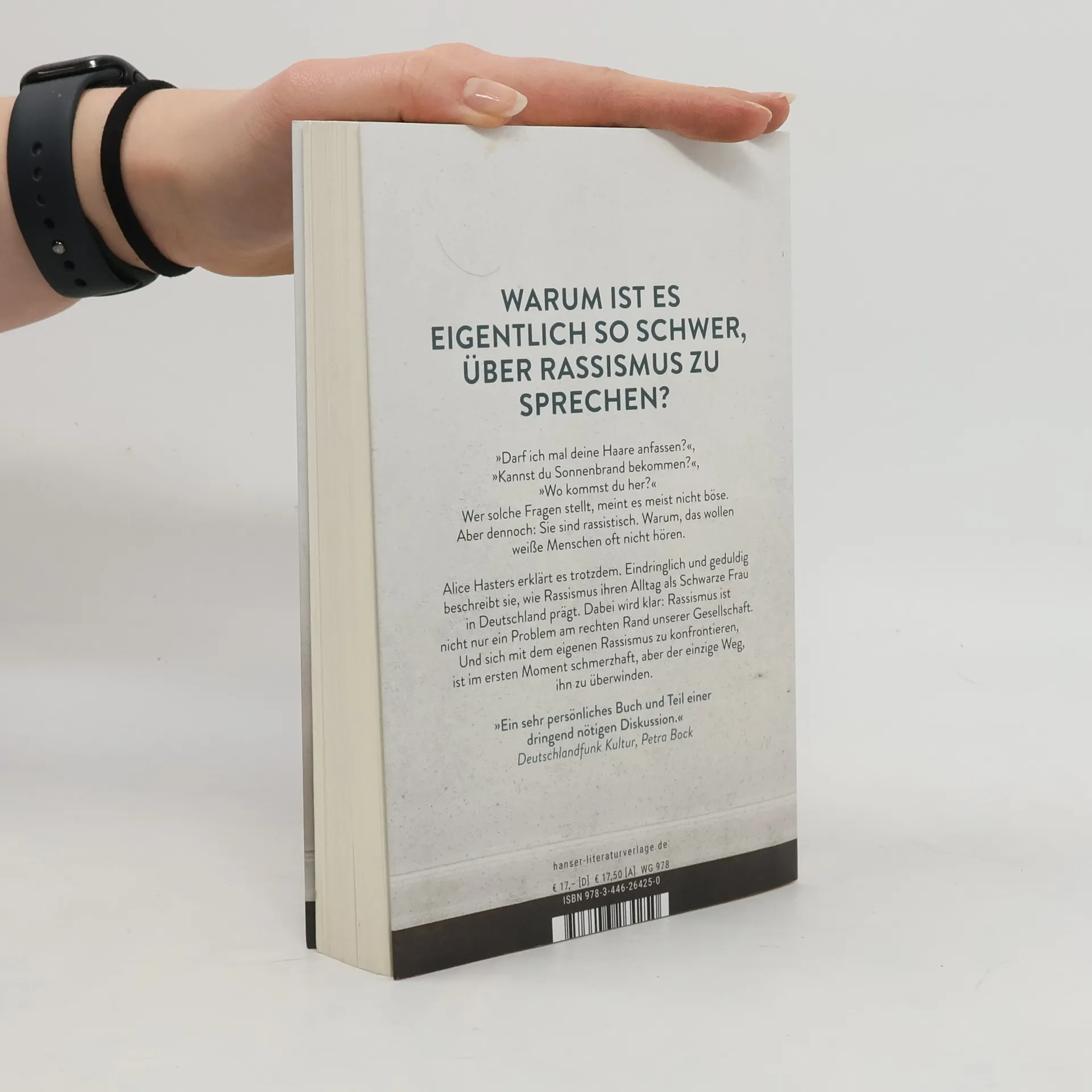 Wer Rassismus bekämpfen will, muss Veränderung befürworten – und die fängt bei einem selbst an. „Darf ich mal deine Haare anfassen?“, „Kannst du Sonnenbrand bekommen?“, „Wo kommst du her?“ Wer solche Fragen stellt, meint es meist nicht böse. Aber dennoch: Sie sind rassistisch. Warum, das wollen weiße Menschen oft nicht hören. Alice Hasters erklärt es trotzdem. Eindringlich und geduldig beschreibt sie, wie Rassismus ihren Alltag als Schwarze Frau in Deutschland prägt. Dabei wird klar: Rassismus ist nicht nur ein Problem am rechten Rand der Gesellschaft. Und sich mit dem eigenen Rassismus zu konfrontieren, ist im ersten Moment schmerzhaft, aber der einzige Weg, ihn zu überwinden.