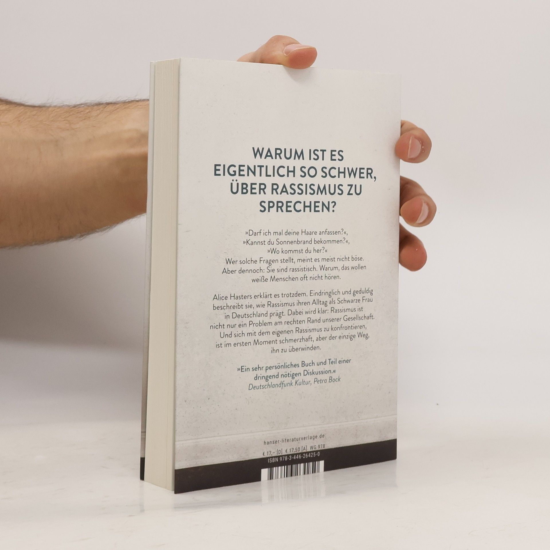 Wer Rassismus bekämpfen will, muss Veränderung befürworten – und die fängt bei einem selbst an. „Darf ich mal deine Haare anfassen?“, „Kannst du Sonnenbrand bekommen?“, „Wo kommst du her?“ Wer solche Fragen stellt, meint es meist nicht böse. Aber dennoch: Sie sind rassistisch. Warum, das wollen weiße Menschen oft nicht hören. Alice Hasters erklärt es trotzdem. Eindringlich und geduldig beschreibt sie, wie Rassismus ihren Alltag als Schwarze Frau in Deutschland prägt. Dabei wird klar: Rassismus ist nicht nur ein Problem am rechten Rand der Gesellschaft. Und sich mit dem eigenen Rassismus zu konfrontieren, ist im ersten Moment schmerzhaft, aber der einzige Weg, ihn zu überwinden.