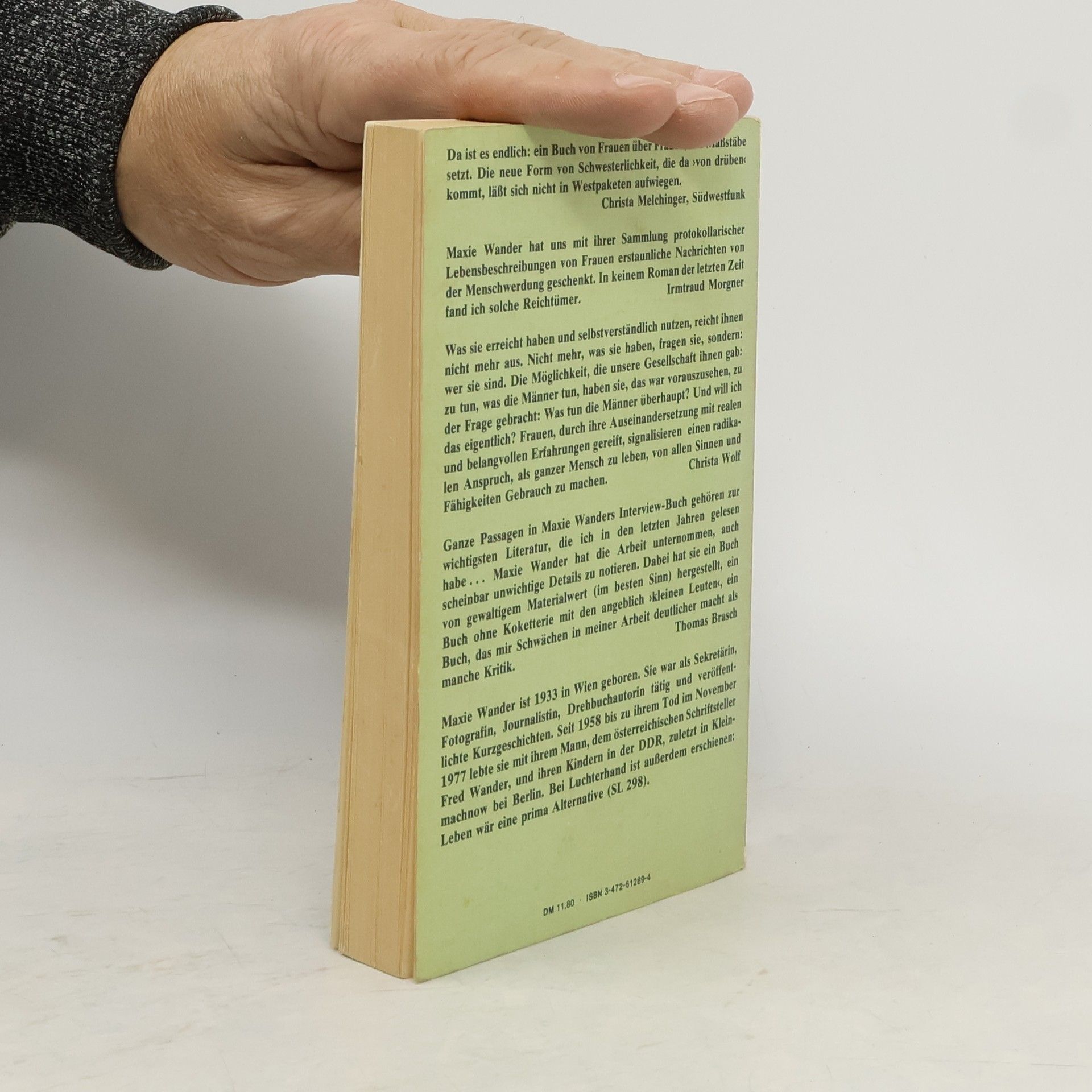 Eine Sammlung von Geschichten von Frauen, nach Unterhaltungen, die die Autorin Maxie Wander mit Tonband aufnahm. Maxie Wander lebte in der DDR und kämpfte dort Zeit ihres Lebens für die Kunstfreiheit.