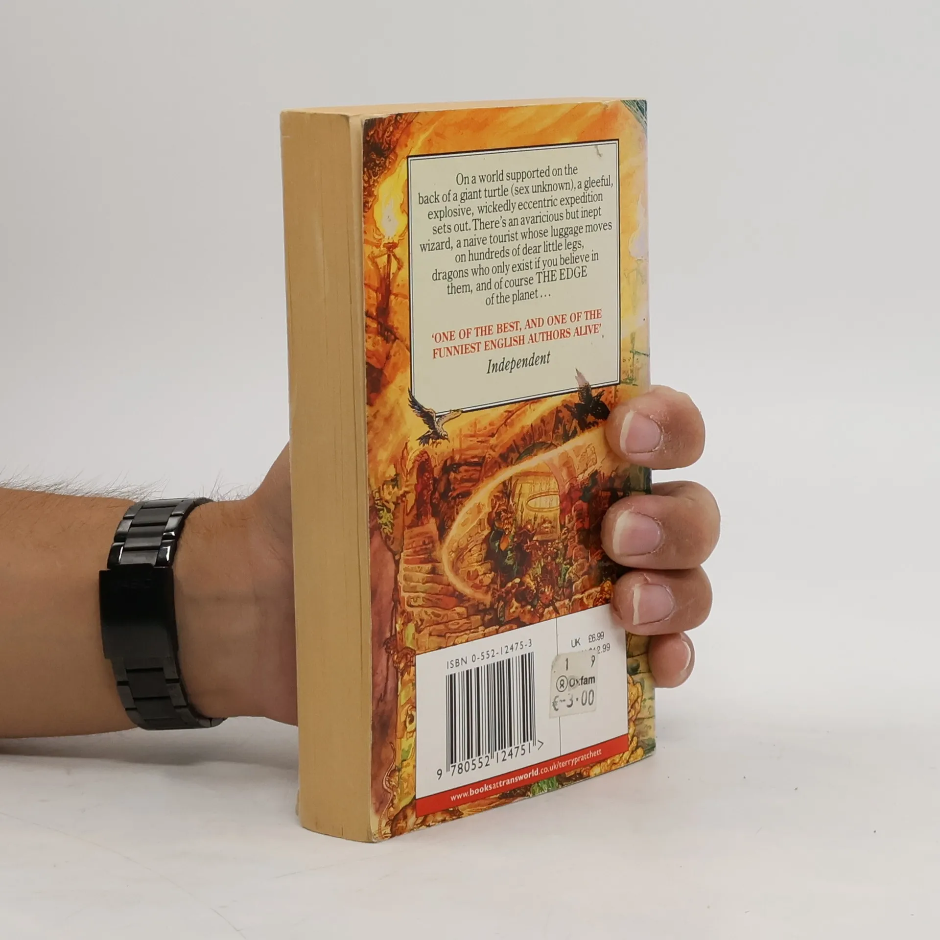 On a world supported on the back of a giant turtle (sex unknown), a gleeful, explosive, wickedly eccentric expedition sets out. There's an avaricious buy inept wizard, a naïve tourist whose luggage moves on hundreds of dear little legs, dragons who only exist ifyou believe in them, and of course THE EDGE of the planet...
