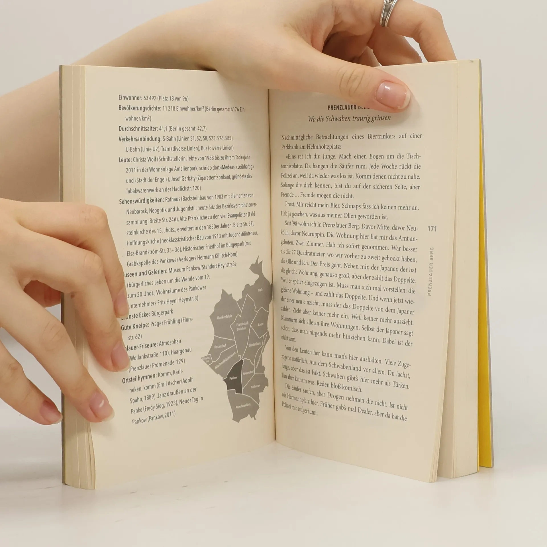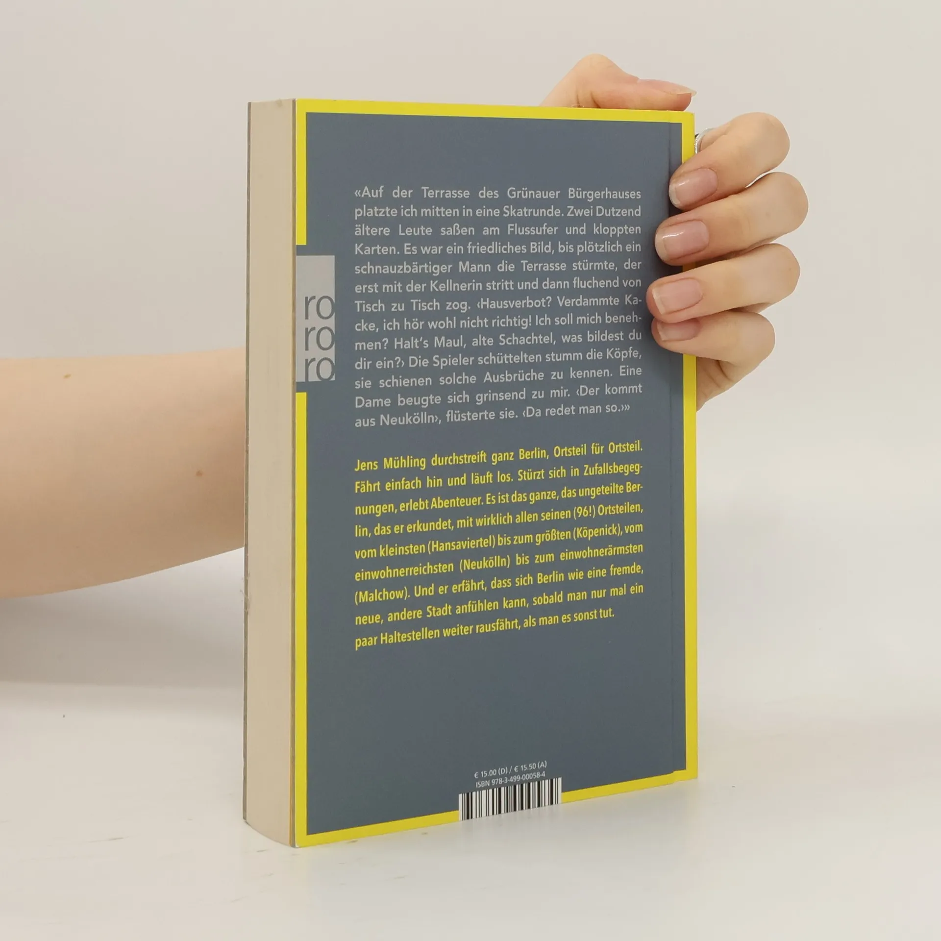 Jens Mühling durchstreift ganz Berlin, Ortsteil für Ortsteil. Fährt einfach hin und läuft los. Stürzt sich in Zufallsbegegnungen, erlebt Abenteuer. Es ist das ganze, das ungeteilte Berlin, das er erkundet, mit wirklich allen seinen Ortsteilen (97!), vom kleinsten (Hansaviertel) bis zum größten (Köpenick), vom einwohnerreichsten (Prenzlauer Berg) bis zum einwohnerärmsten (Malchow). Und er erfährt, dass sich Berlin wie eine fremde, neue, andere Stadt anfühlen kann, sobald man nur mal ein paar Haltestellen weiter raus fährt, als man es sonst tut.